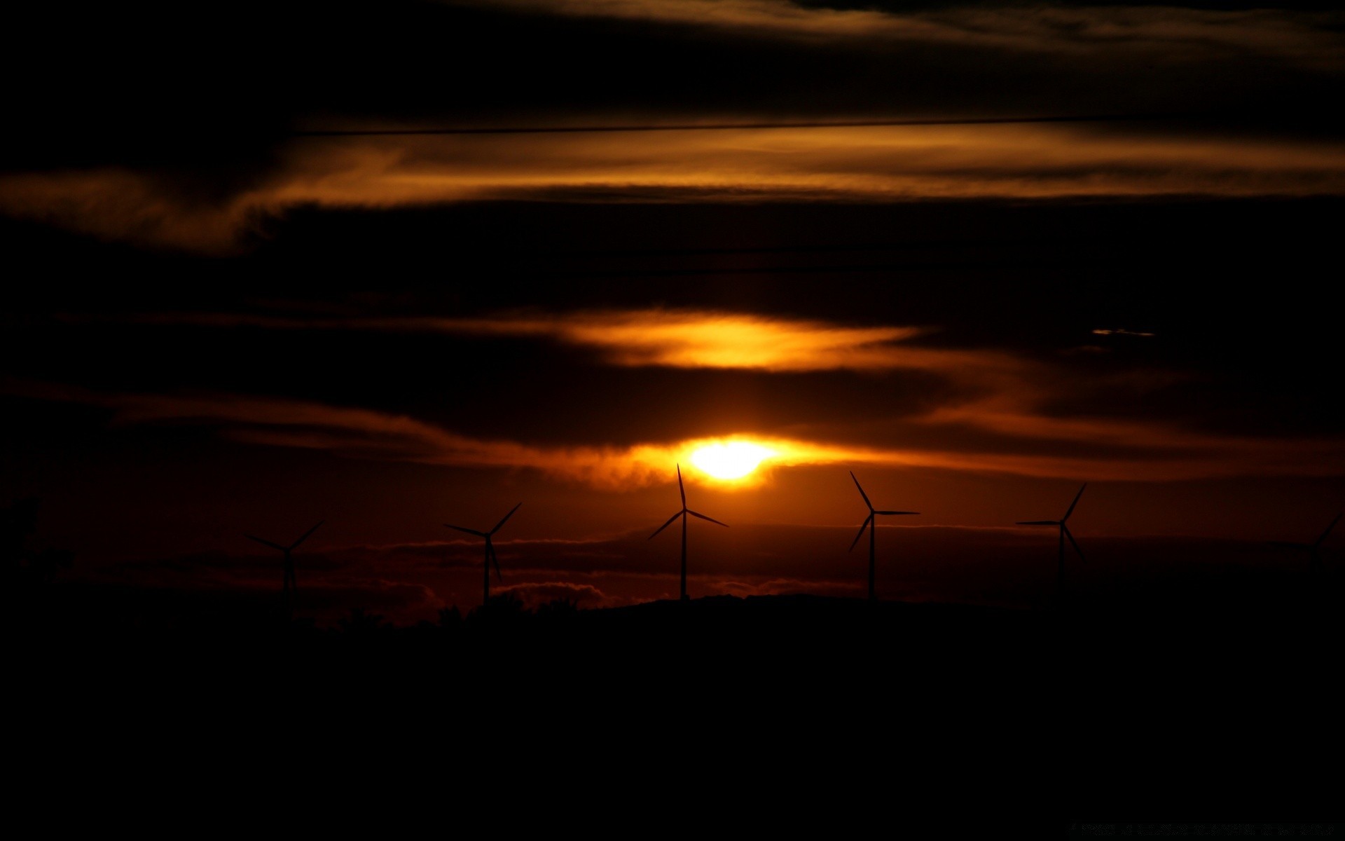 Windkraftanlagen im Hintergrund des Sonnenuntergangs