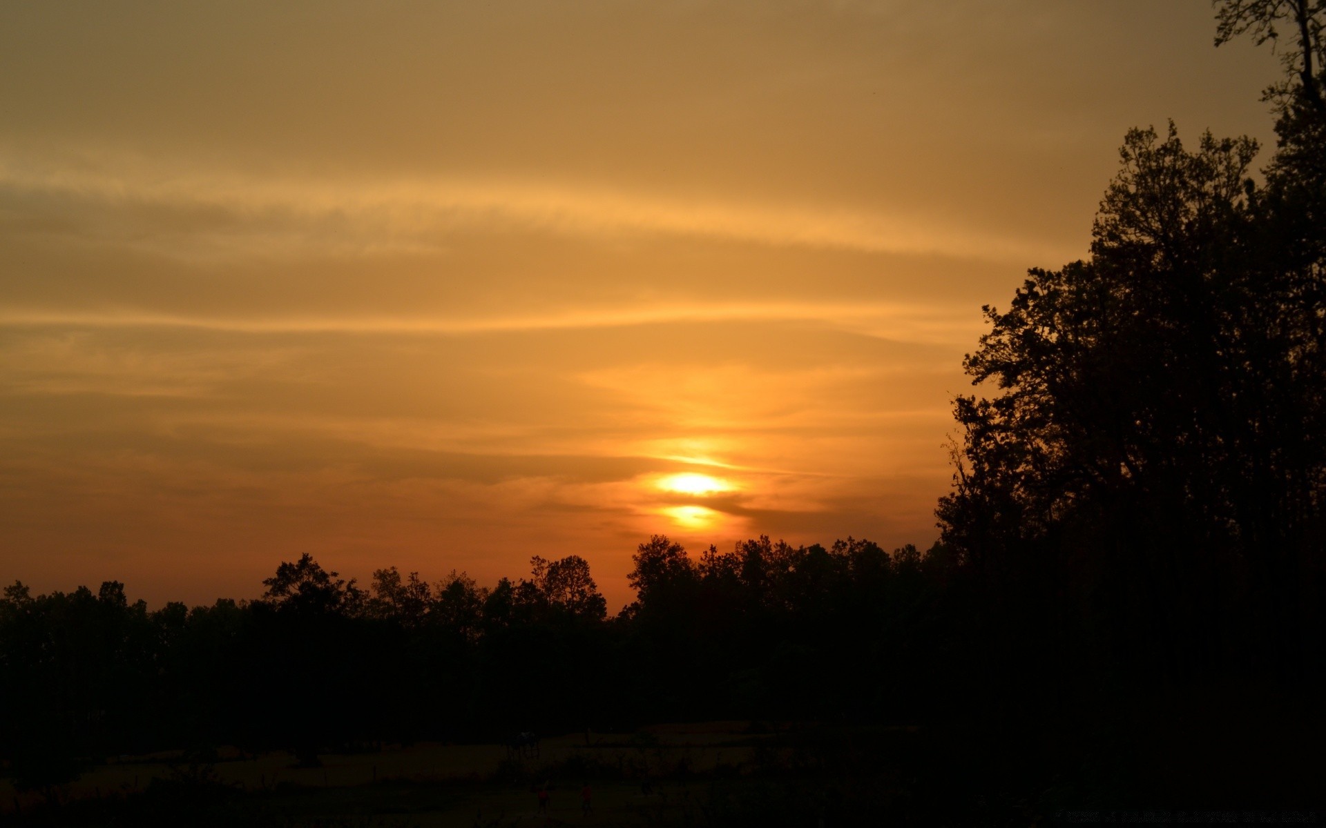 Der orangefarbene Himmel und die Bäume, die im Schatten stehen, sind von erstaunlicher Schönheit