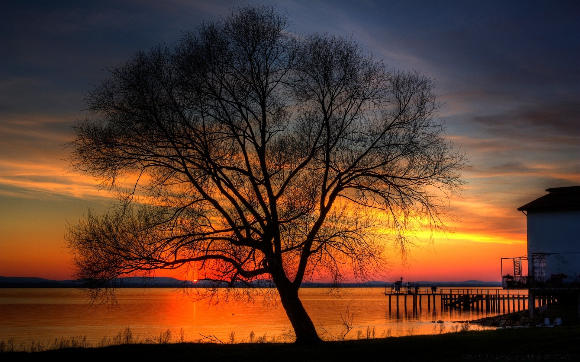 Heller Sonnenuntergang in der Dämmerung am Wasser