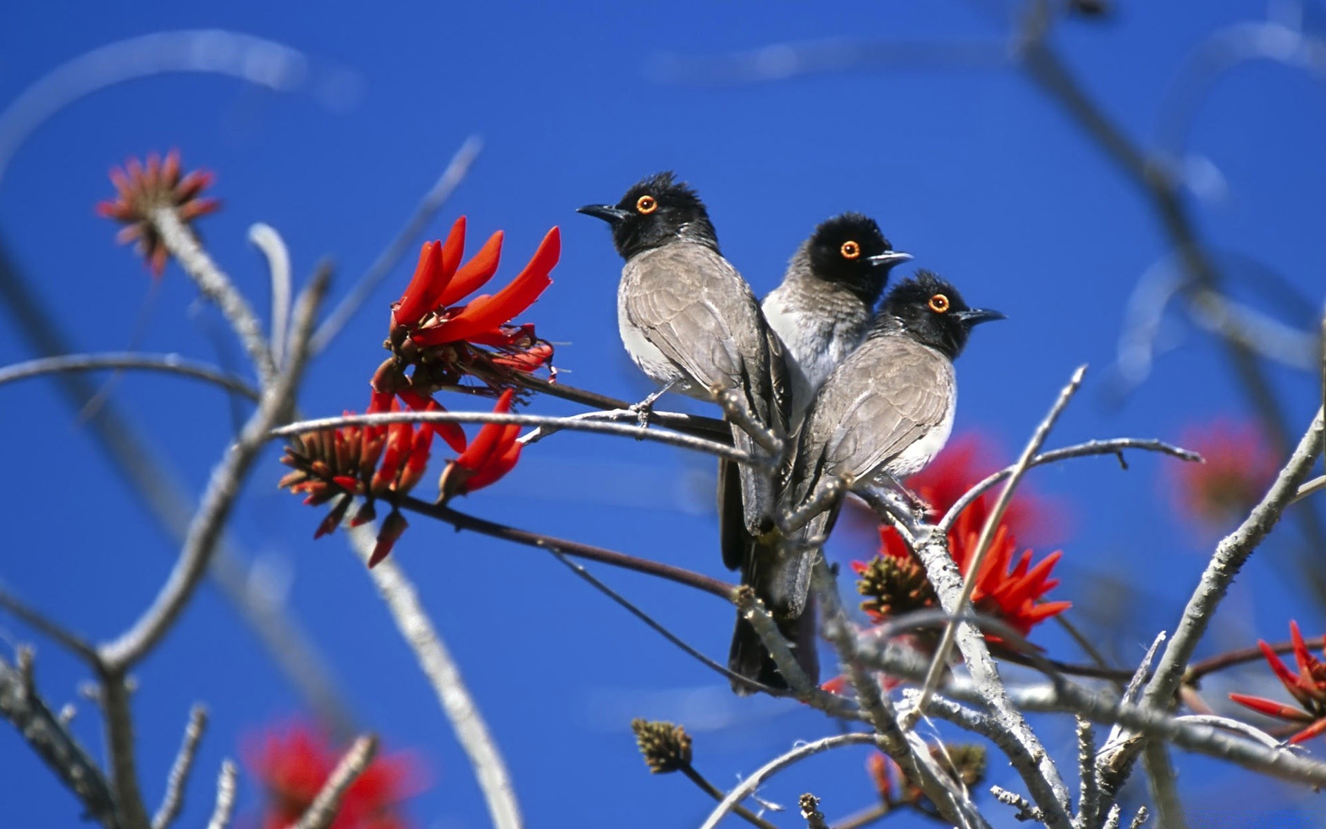 Auf einem Ast im Freien sitzen drei Vögel
