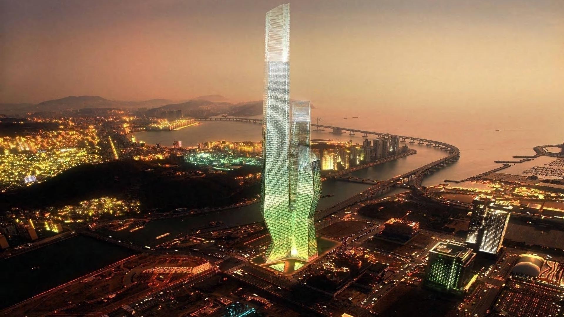 Eine Stadt mit Wolkenkratzern am See und Lichtern