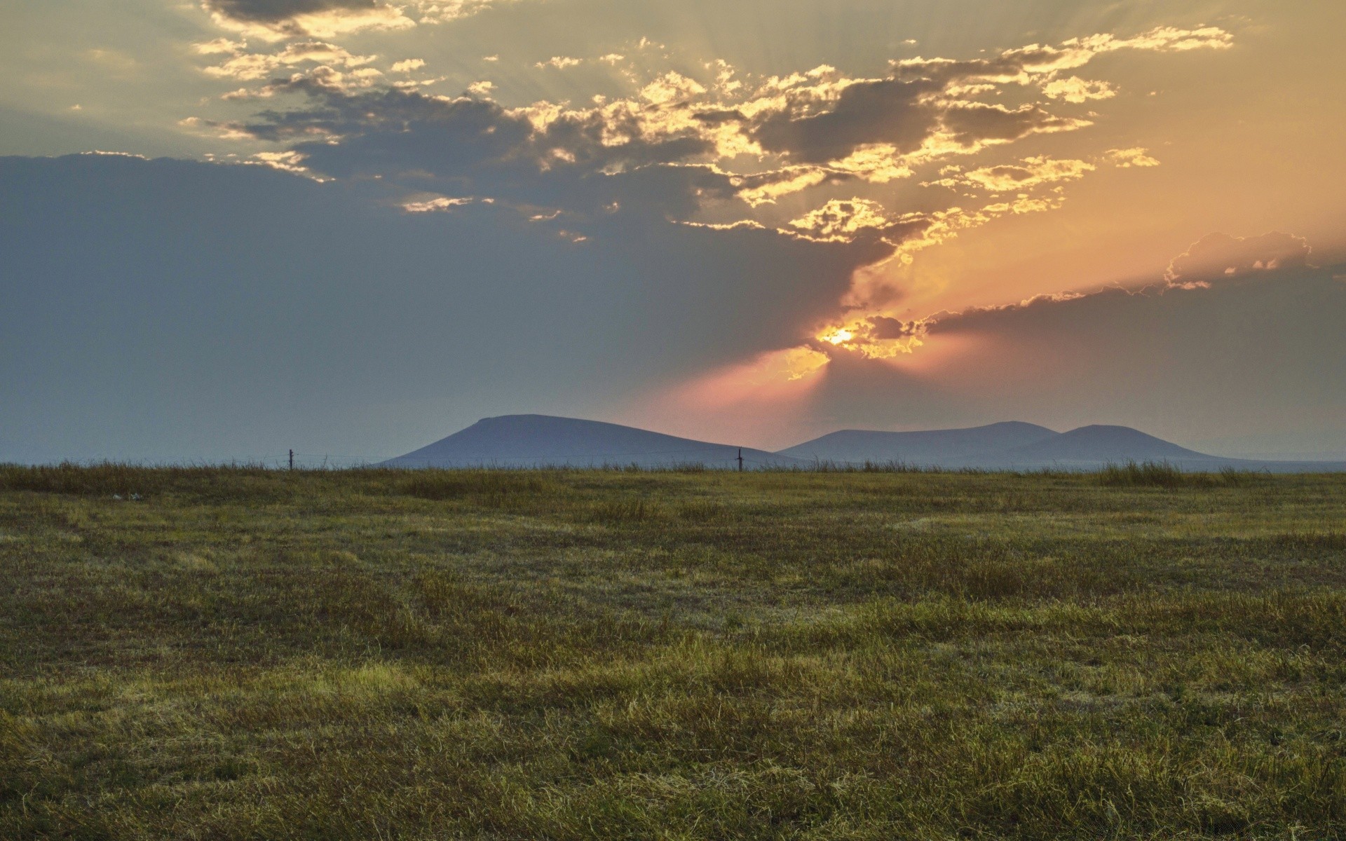 Sonnenuntergang hinter den hügeln in der endlosen steppeSonnenuntergang hinter den Hügeln in der endlosen Steppe