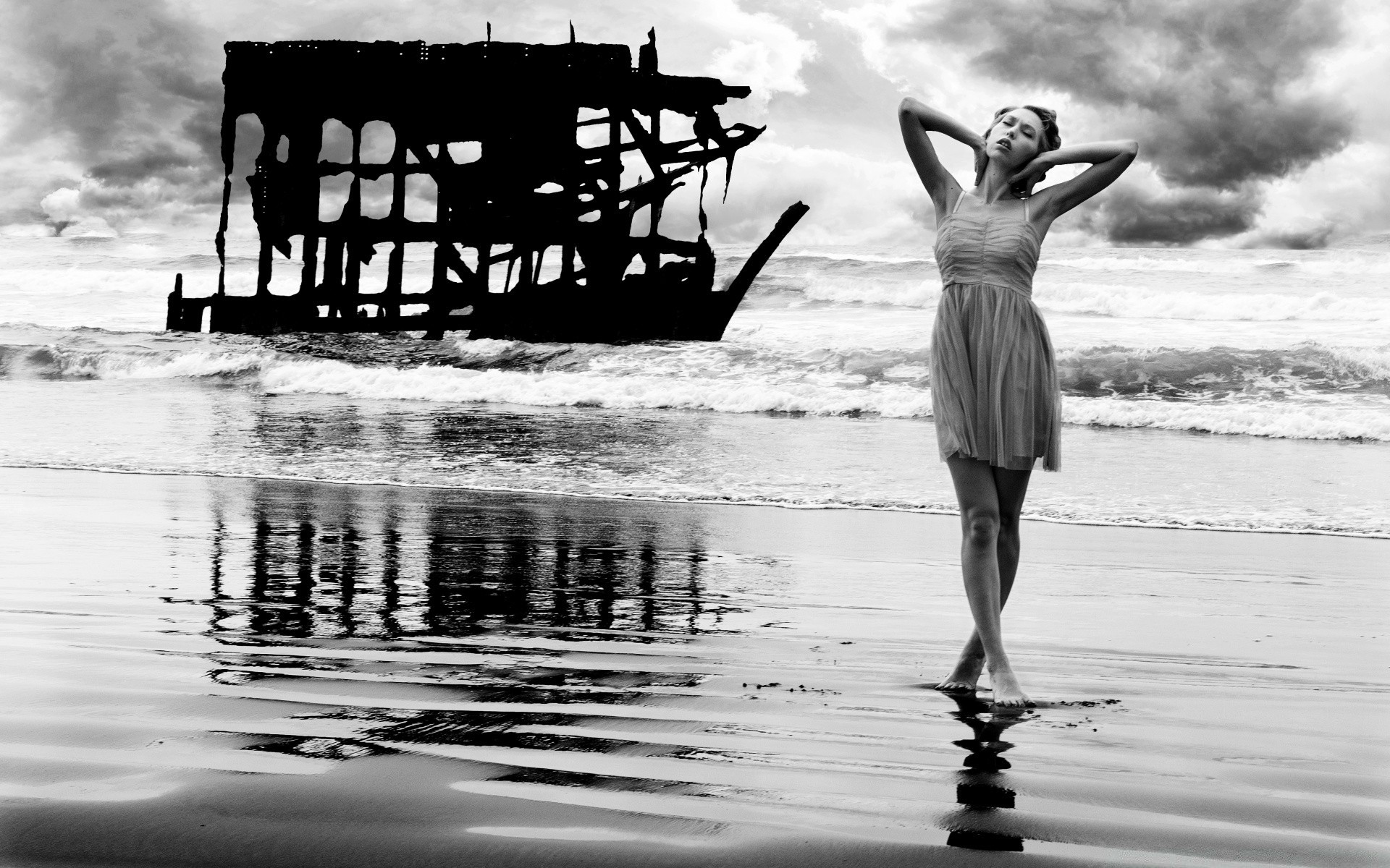 Der Ozean wäscht einen steinigen Strand, ein Leuchtturm ist in der Ferne zu sehen