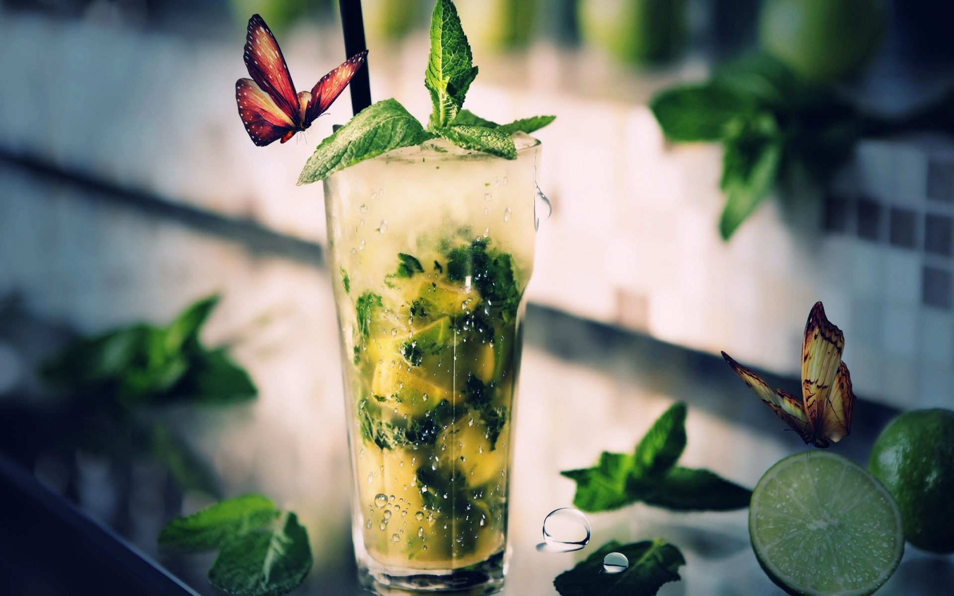 Trinken Sie mit Früchten im Glas und Schmetterlingen