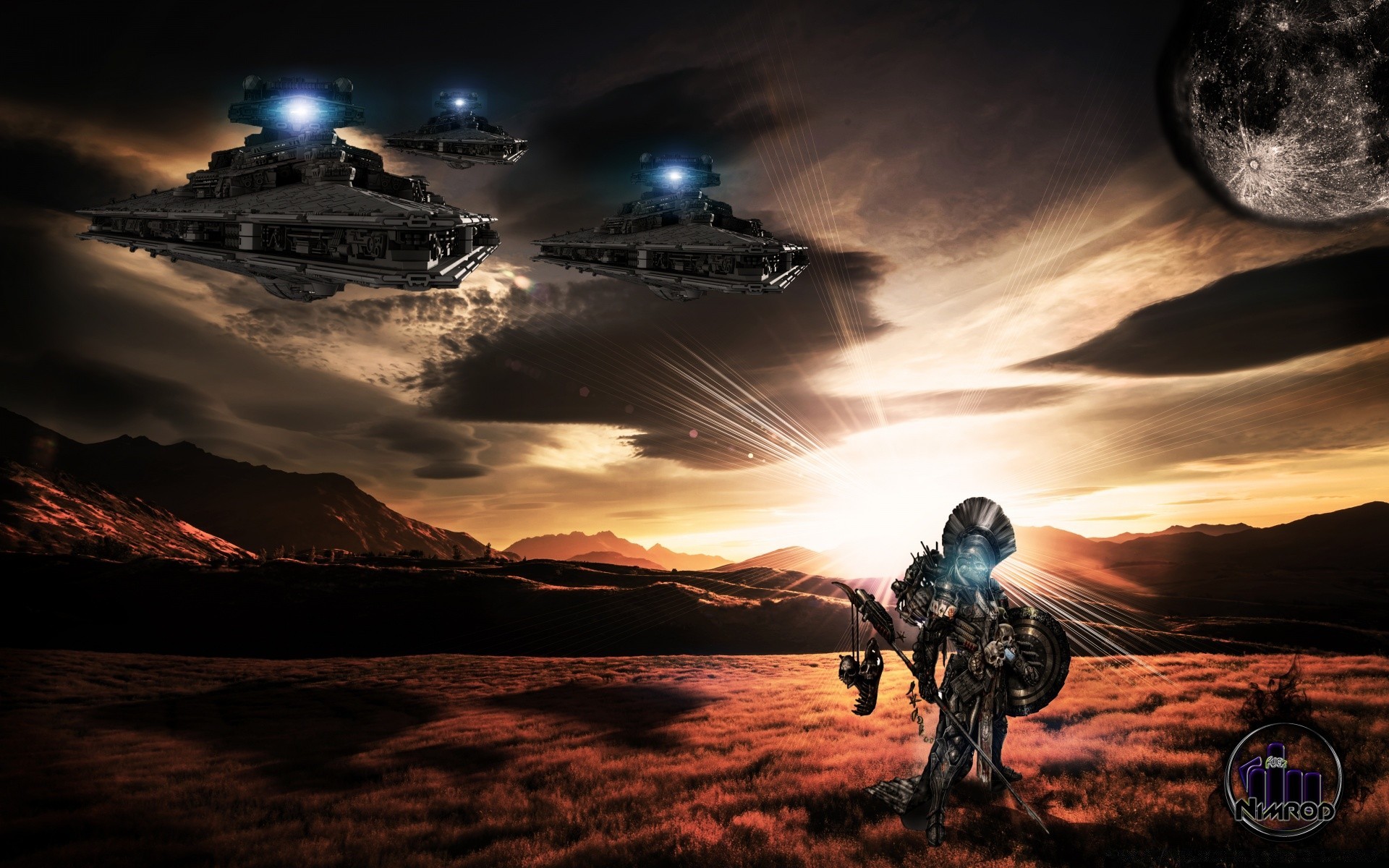 Roboter auf dem Hintergrund von rotem Sonnenuntergang und Mond