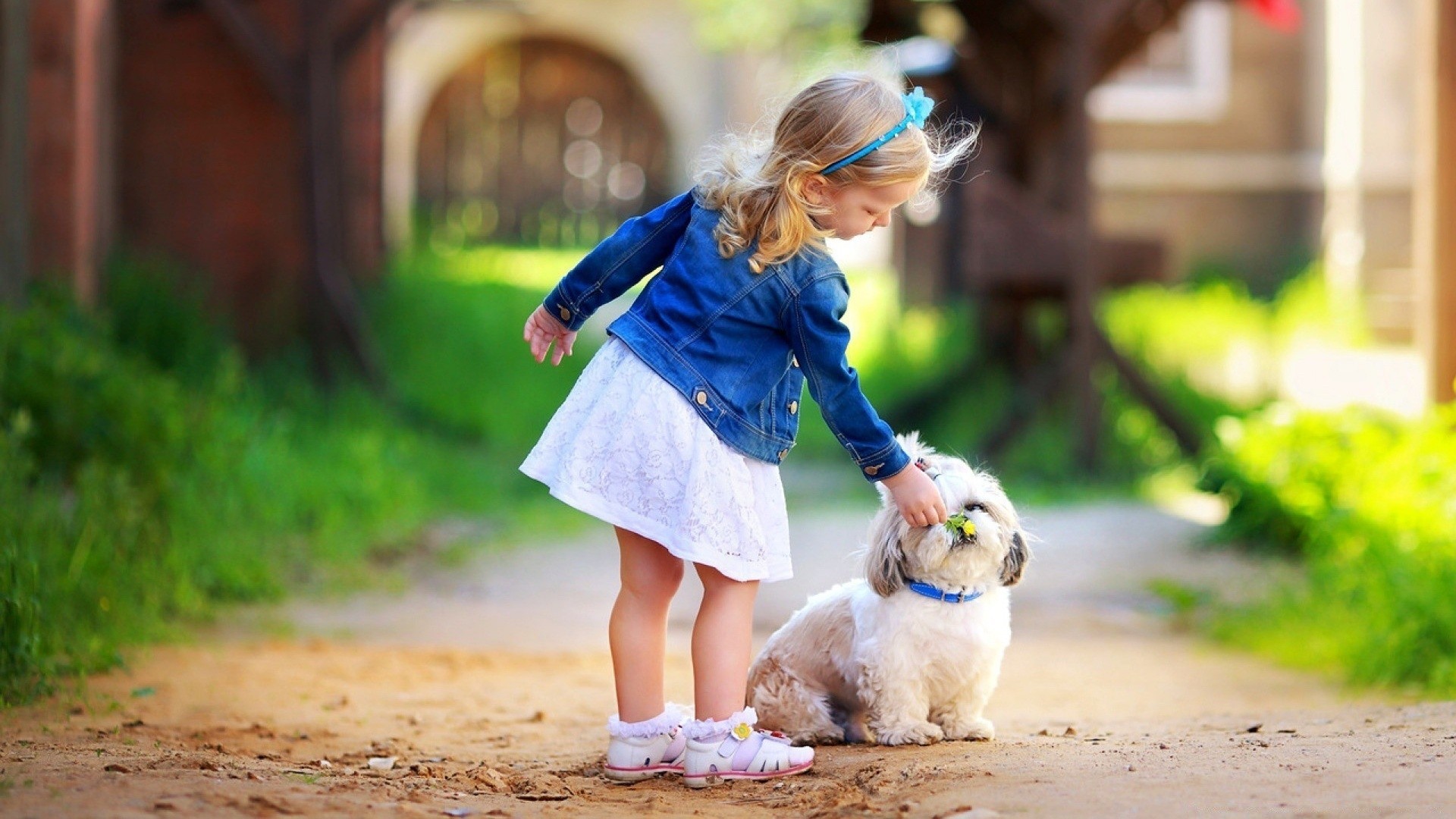 Kleines Mädchen in einem Kleid und einer Jeansjacke streichelt einen pelzigen Hund