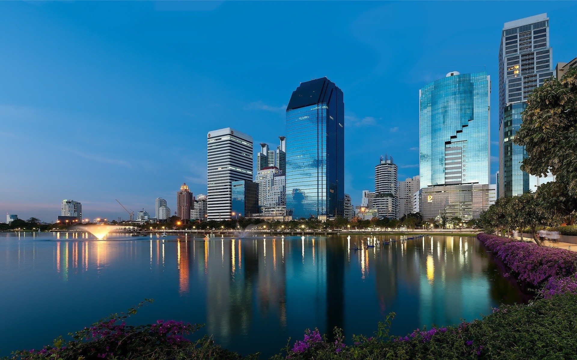 Eine Stadt mit Wolkenkratzern am See und Lichtern