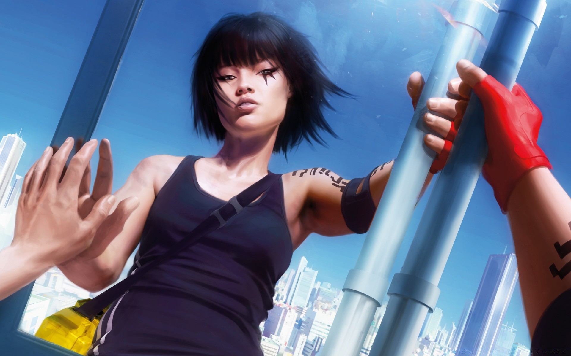 Held des Spiels Farcry 4, posiert vor dem Hintergrund eines Bergsees. in dem der menschliche Schädel reflektiert wird