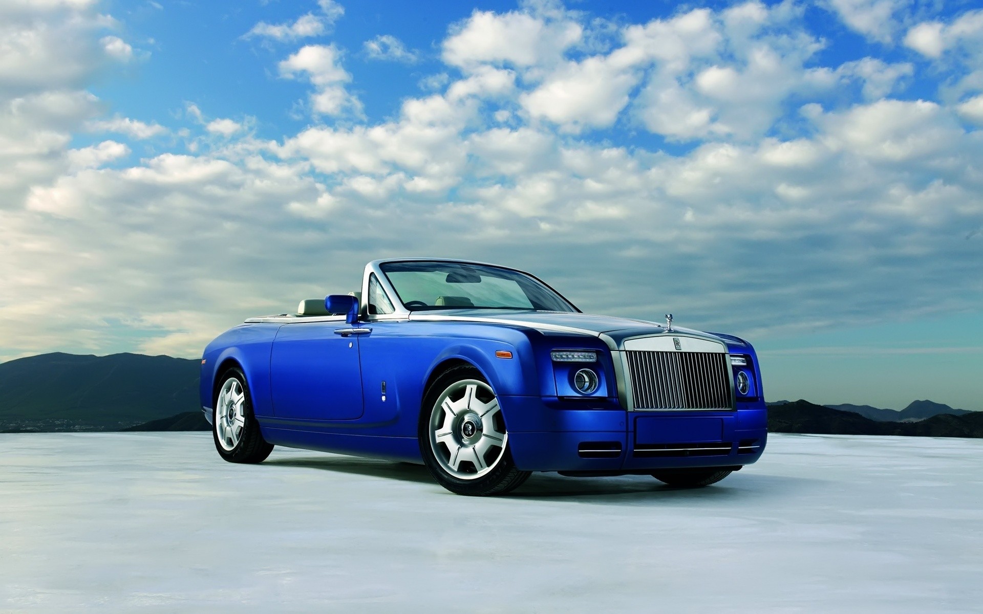 Blaues Auto mit offenem Oberteil und Wolken darüber