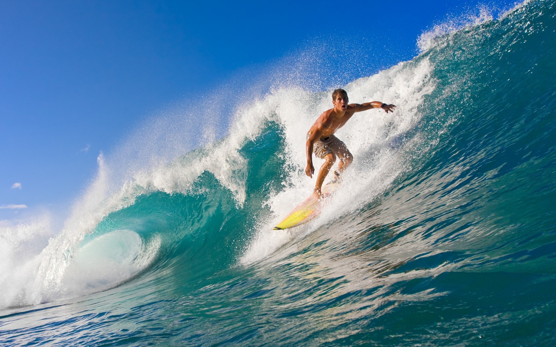 Eine faszinierende türkisfarbene Meereswelle umhüllt den Surfer