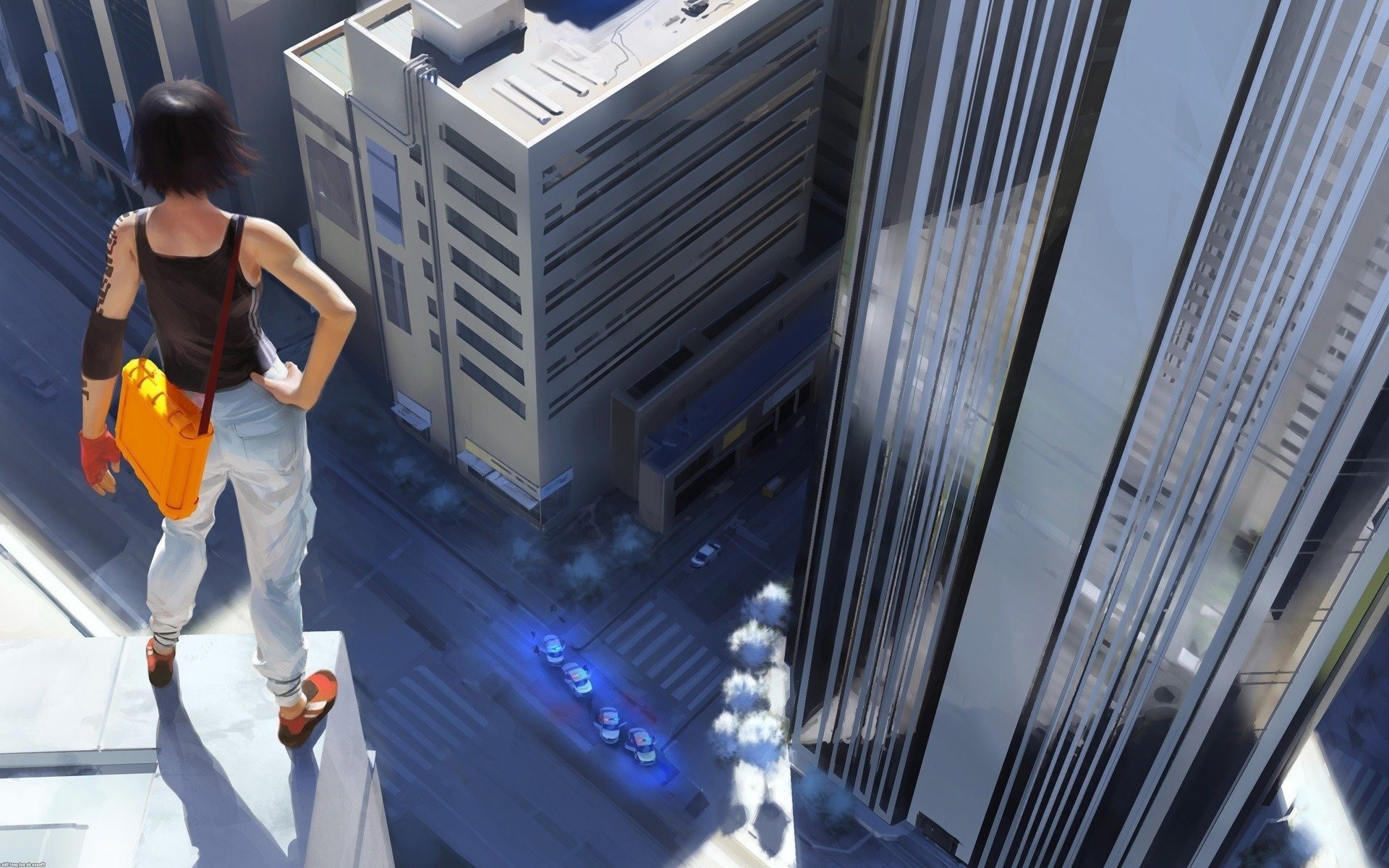 Das Tracer-Mädchen steht am Rande des Daches eines Wolkenkratzers