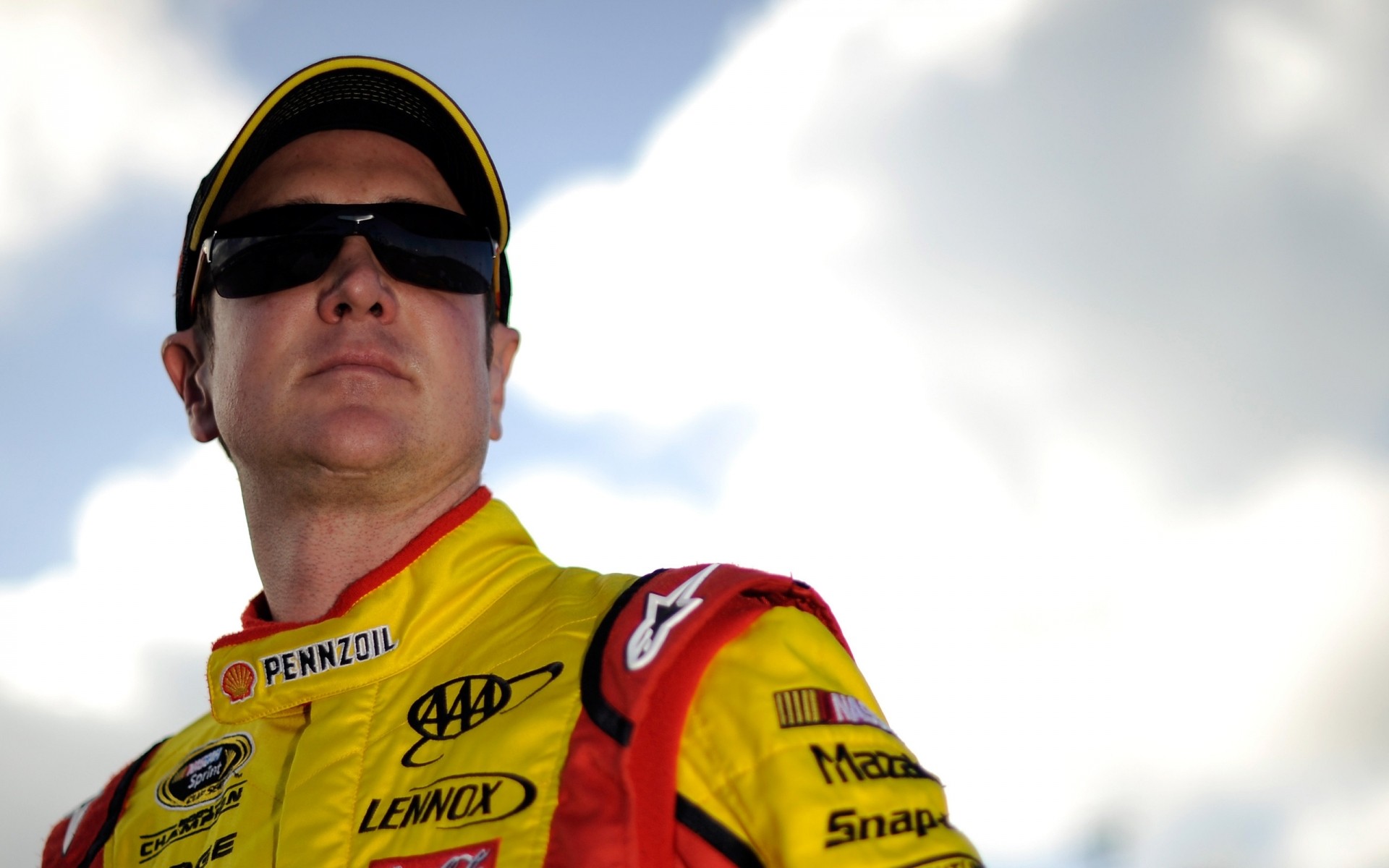 Rennfahrer in Ausrüstung auf Himmelshintergrund