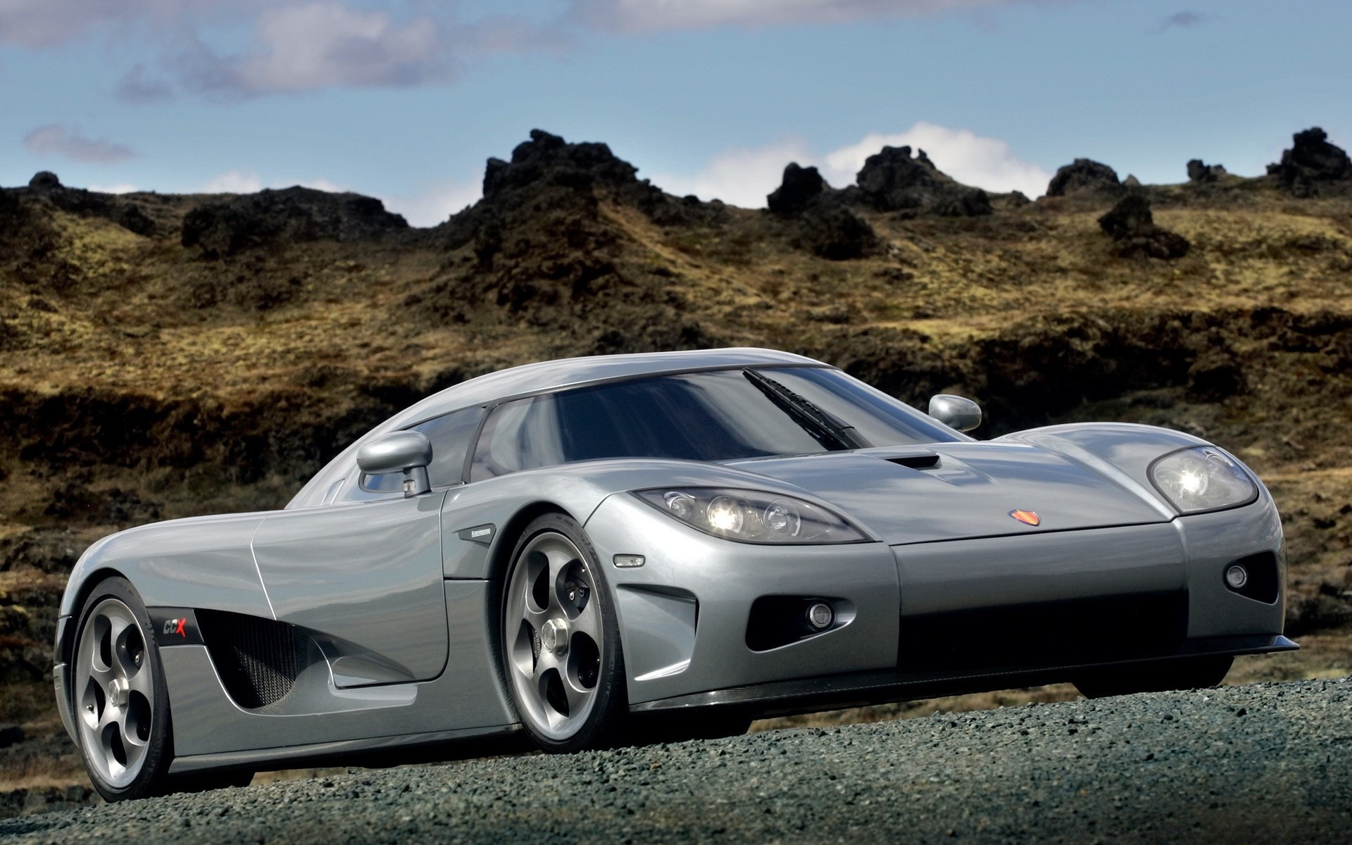 Grauer Bugatti-Sportwagen am Strand am Wasser