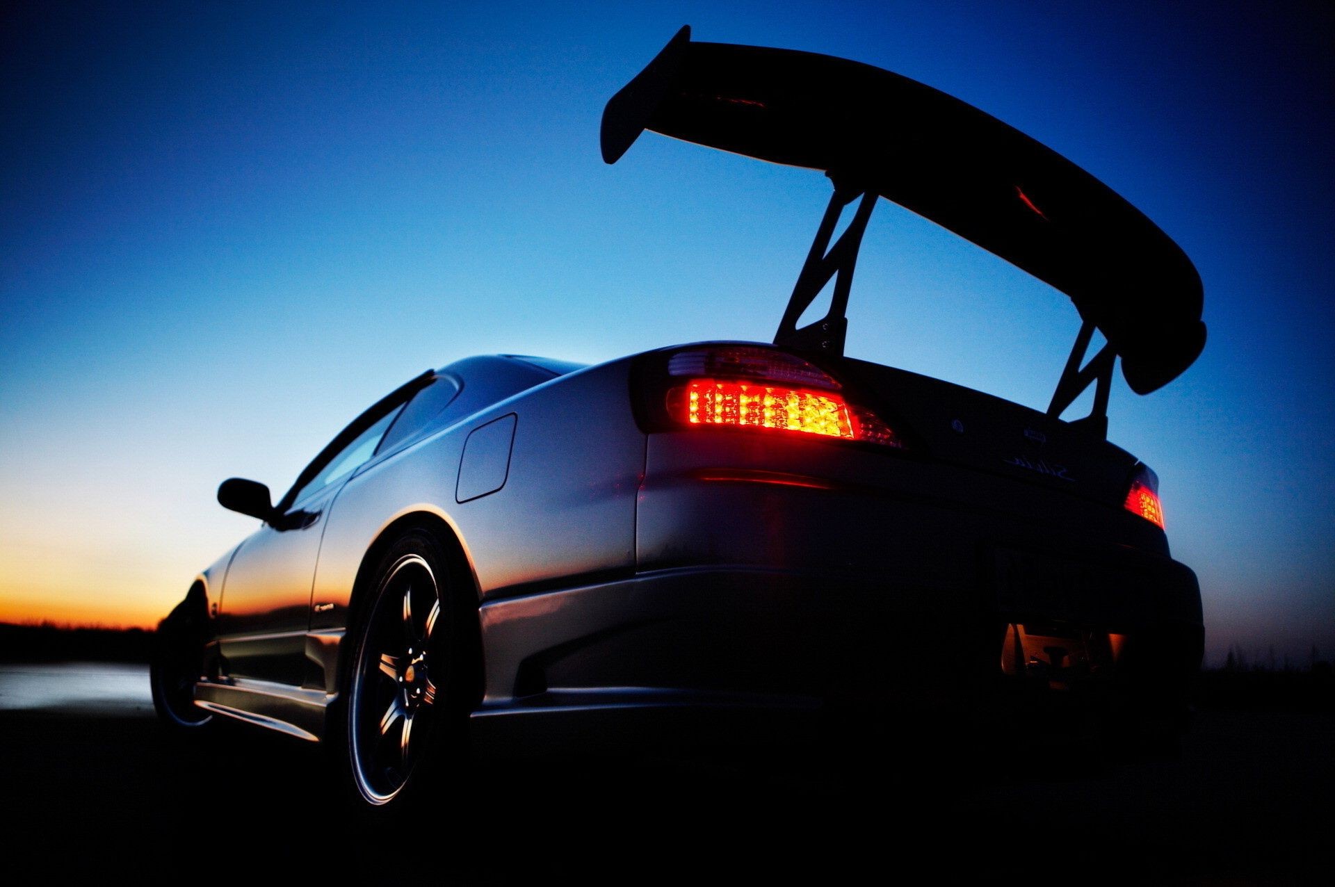 Sportwagen auf Asphalt bei Sonnenuntergang
