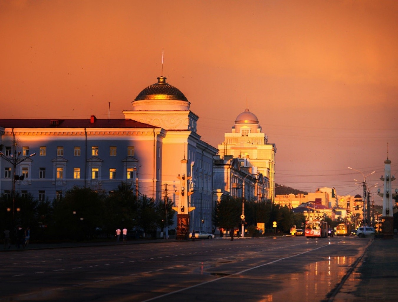 Die Stadt vor dem Hintergrund eines schönen Sonnenuntergangs
