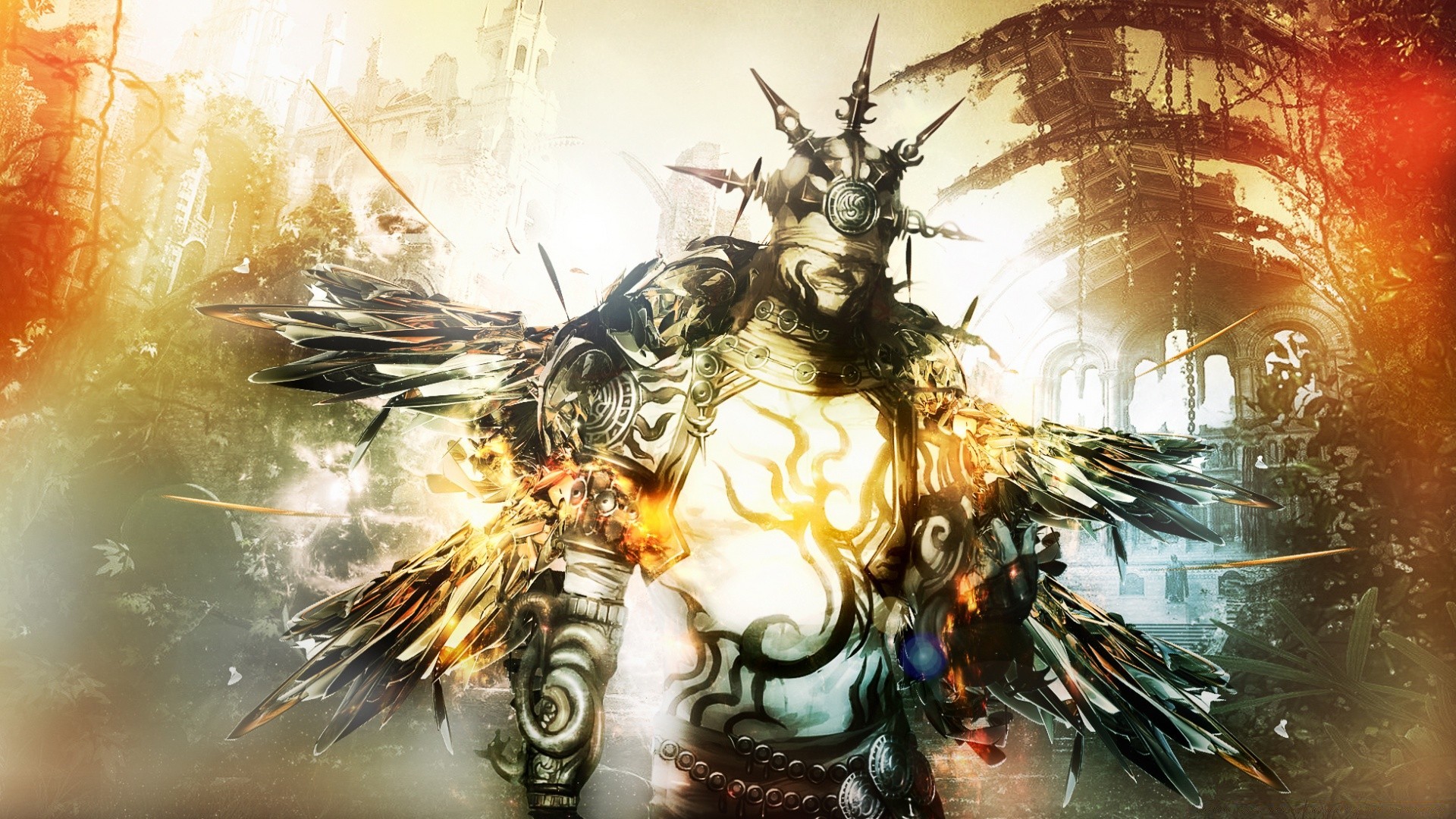 Bildschirmschoner für das Spiel guild Wars mit einem Schatten in Form von Dämonen, die lange Speere in ihren Händen halten