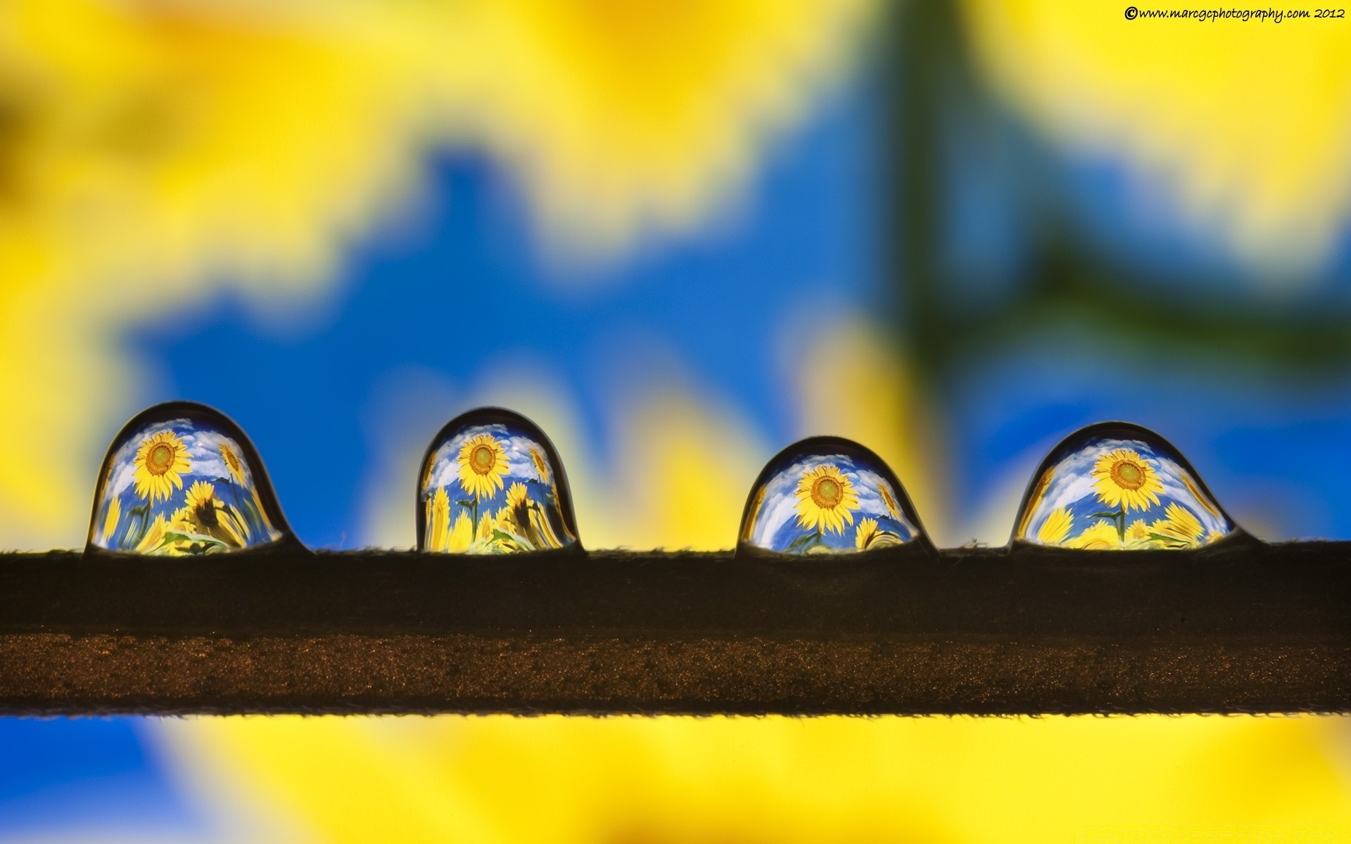 Das Bild ist in einem Tropfen. Makrofotografie. Sonnenblume in einem Tropfen
