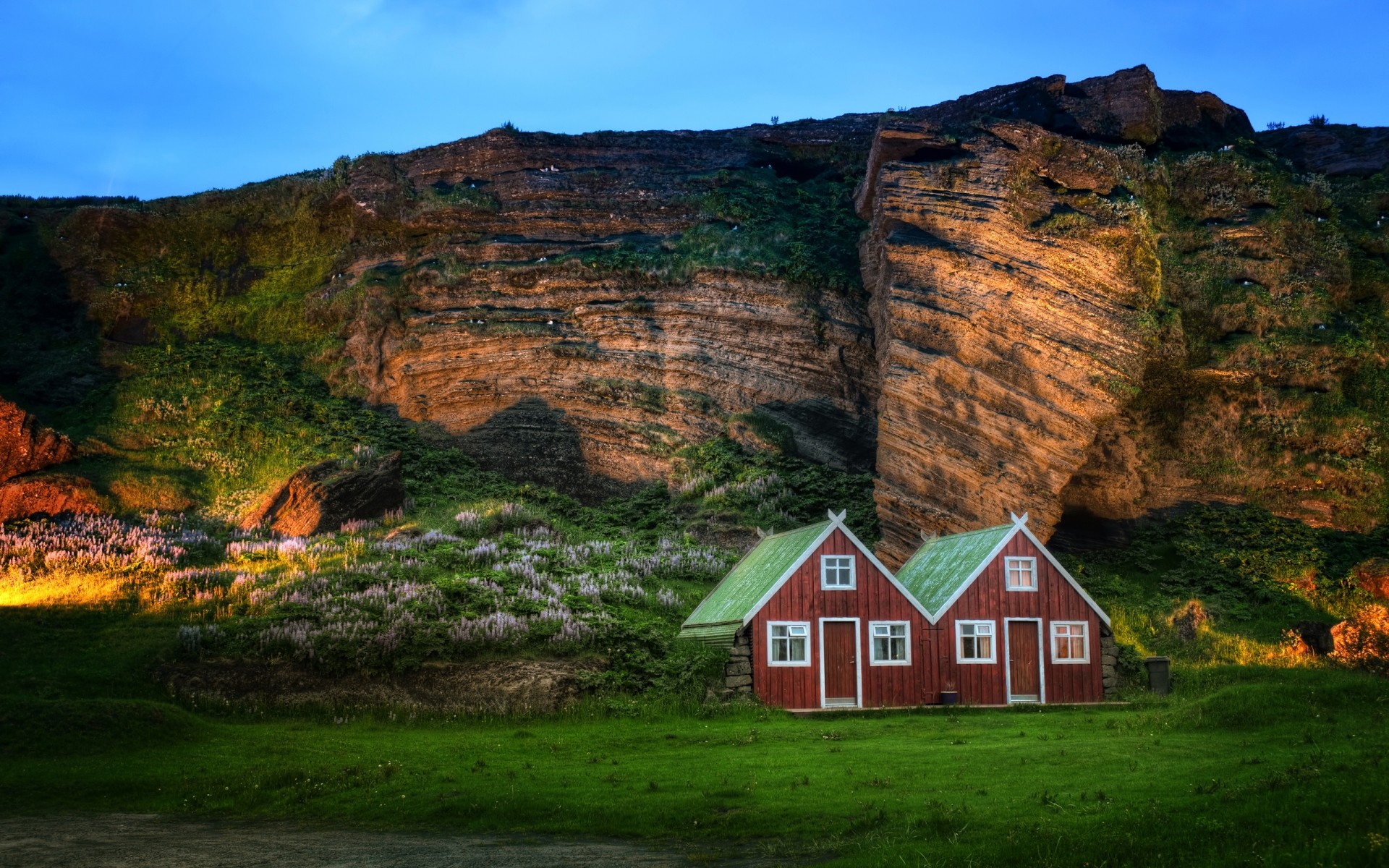 Eine ungewöhnliche landschaft mit bergen und gästehäusernEine ungewöhnliche Landschaft mit Bergen und Gästehäusern