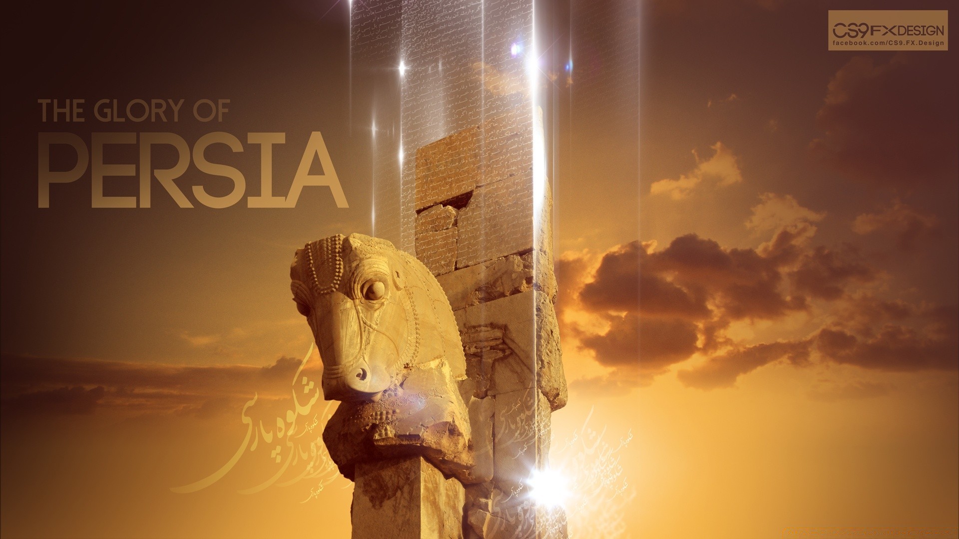 Die Skulptur des Pferdekopfes im alten persidischen Stil vor dem Hintergrund des untergehenden Himmels