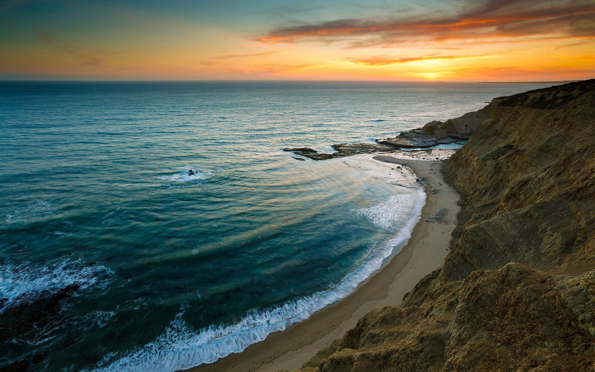 Felsiger Strand mit Sonnenuntergang auf der rechten Seite