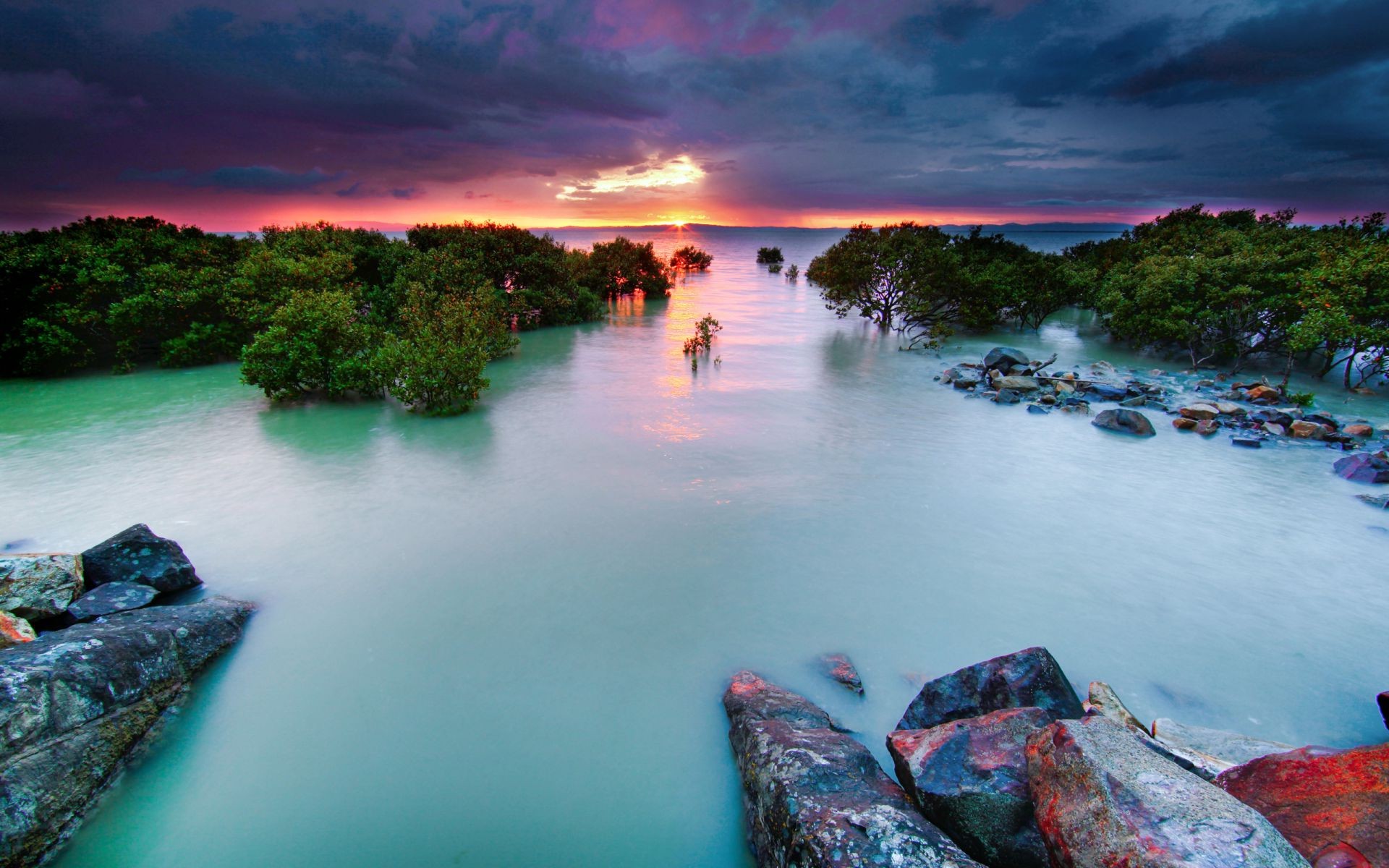 Eine Landschaft mit einem felsigen Strand und einer Wasseroberfläche