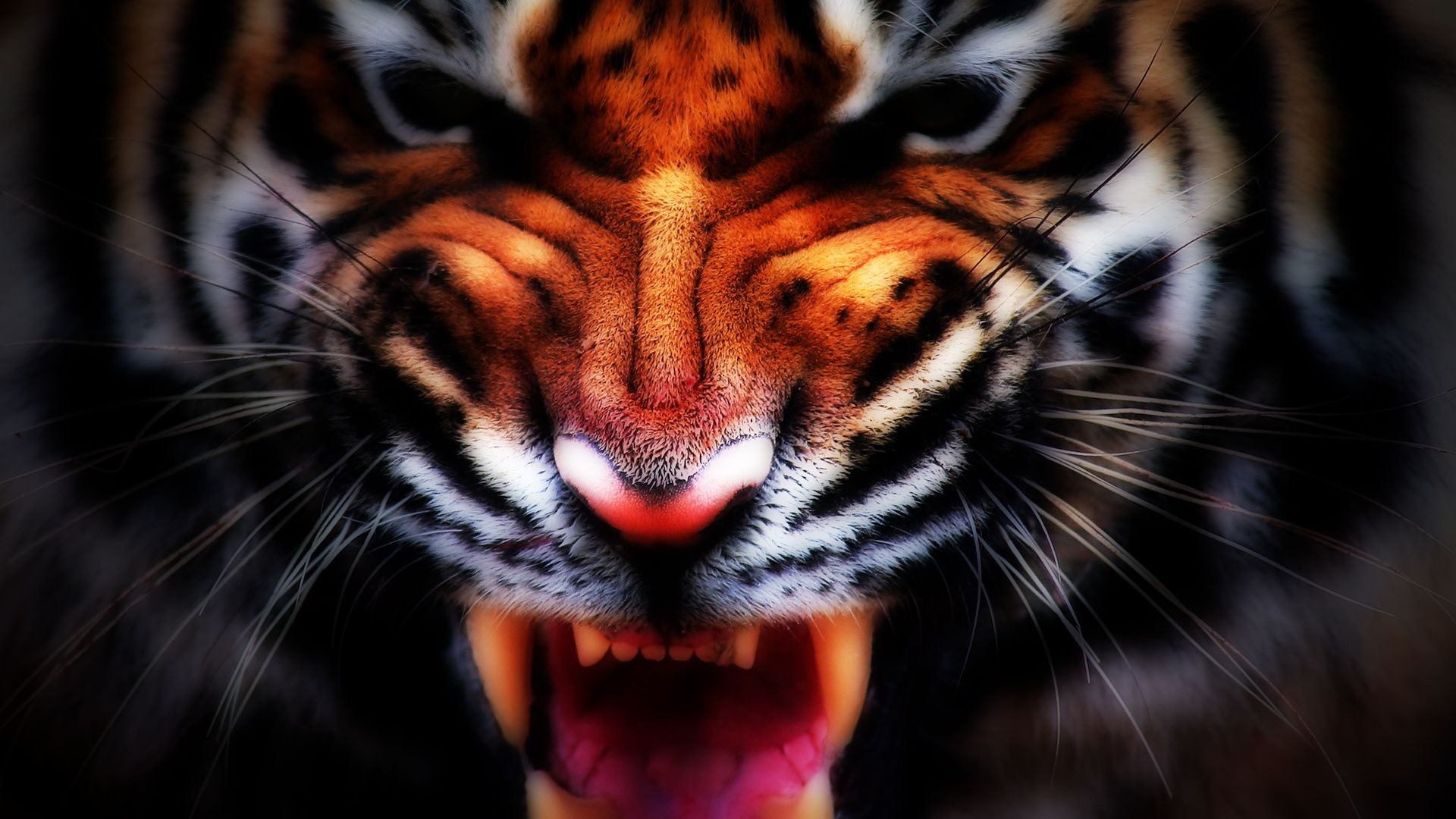 Das Gesicht eines knurrenden Tigers mit offenem Mund