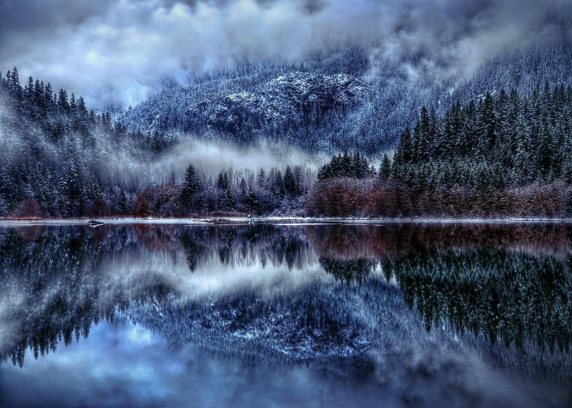 Winterberge und Wald am Fluss