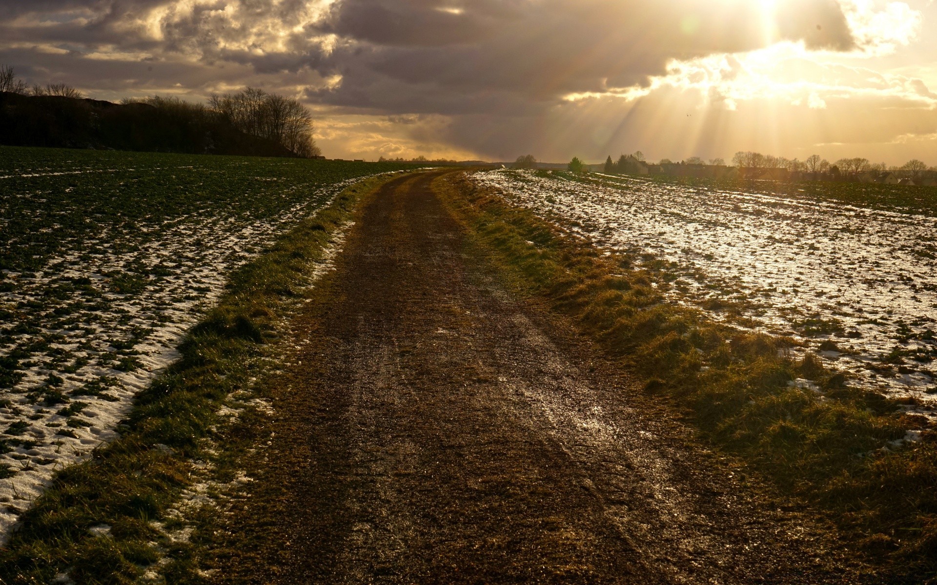 Eine landschaft mit düsterem wetter, eine straße mit einer kurveEine Landschaft mit düsterem Wetter, eine Straße mit einer Kurve