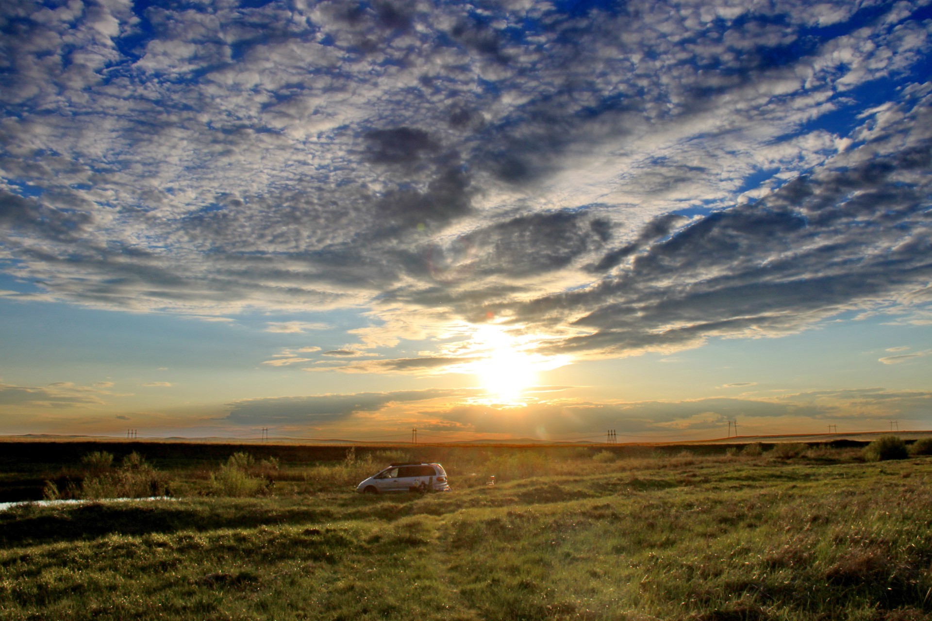 Dämmerung auf dem Hintergrund von Feldern und Wiesen