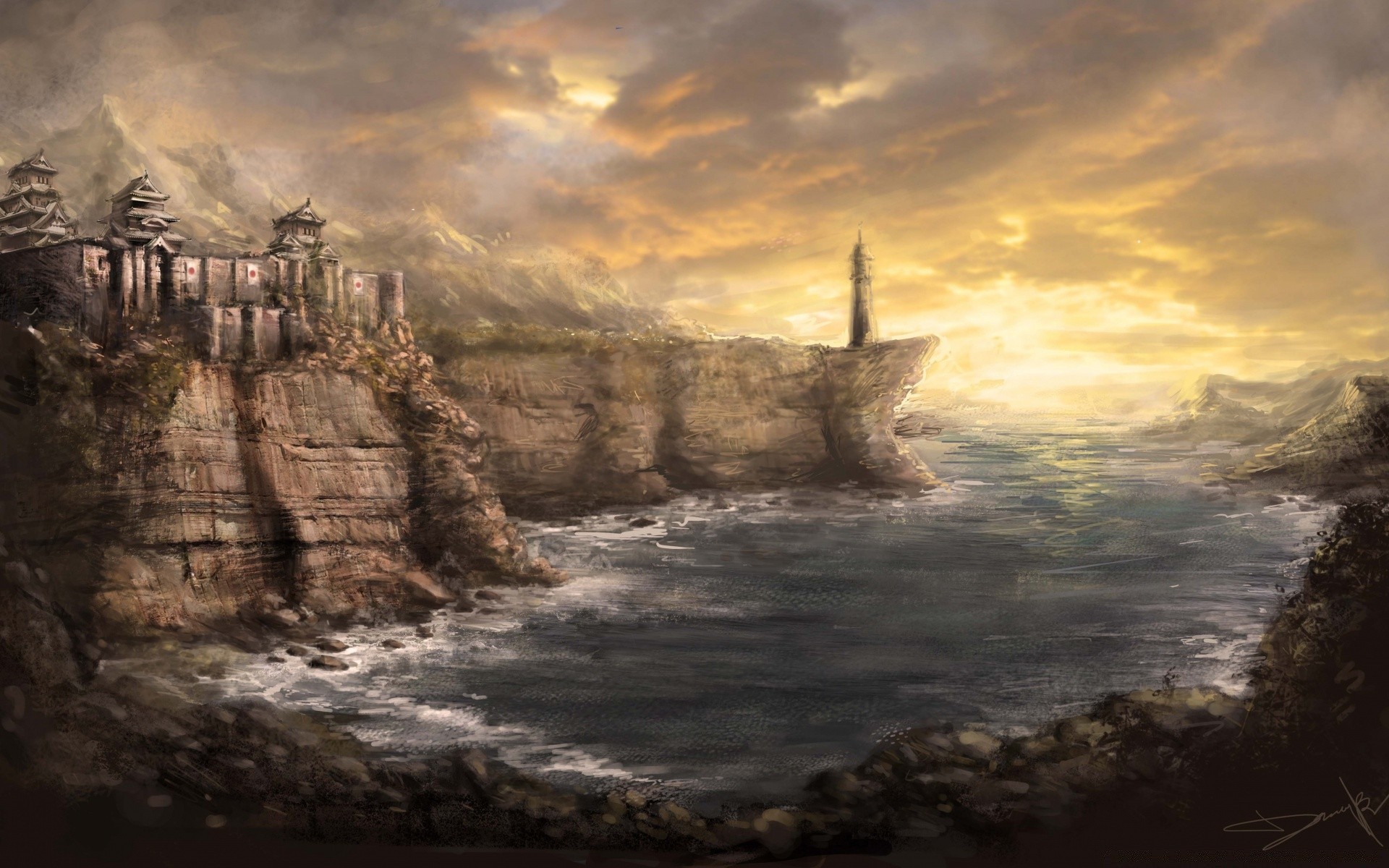Ein leuchtturm an einer steilen felsigen küste unter dem nachthimmel in ah-wolkenEin Leuchtturm an einer steilen felsigen Küste unter dem Nachthimmel in Ah-Wolken