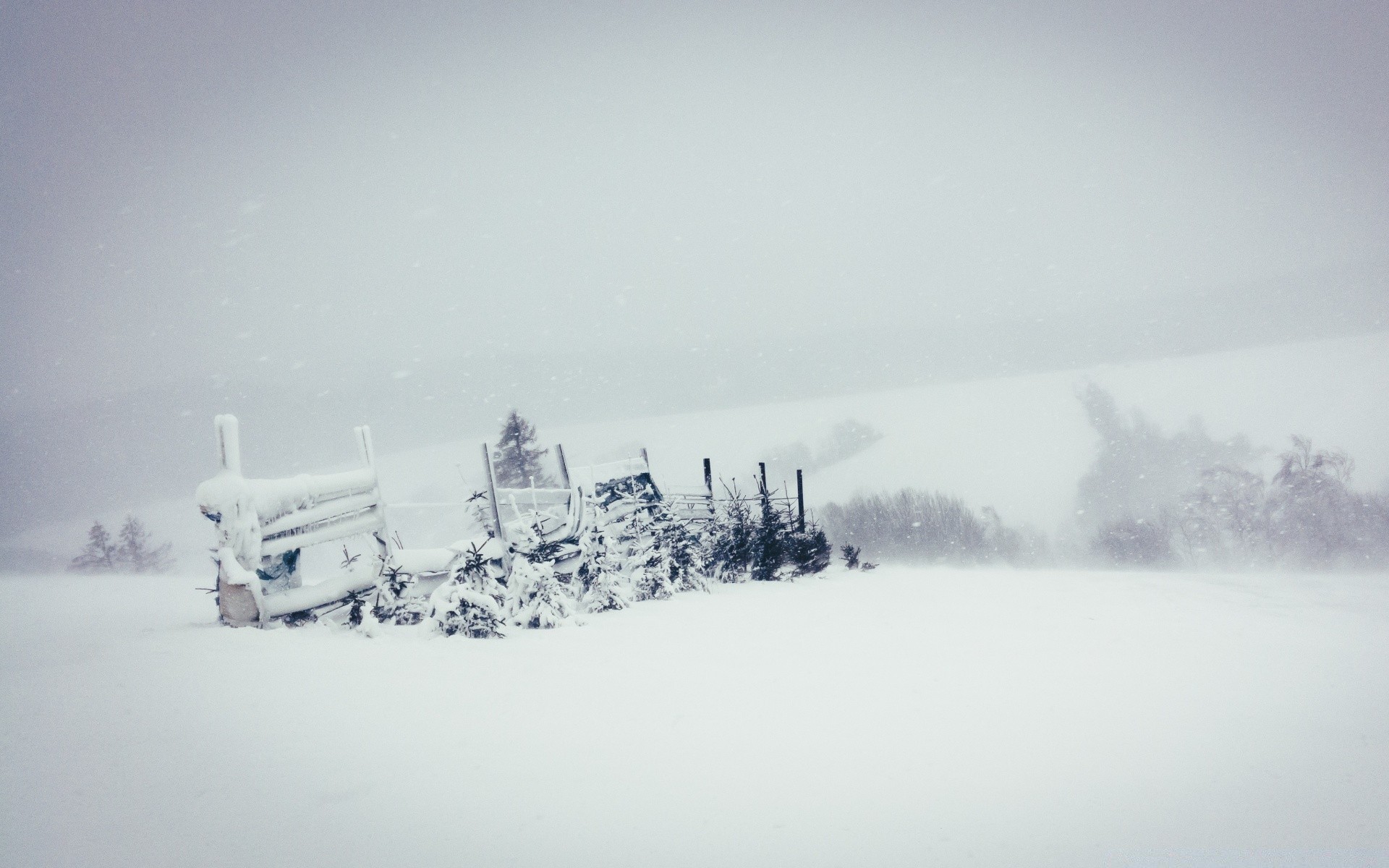 Neblige Landschaft. Winterwald unter dunklem Himmel