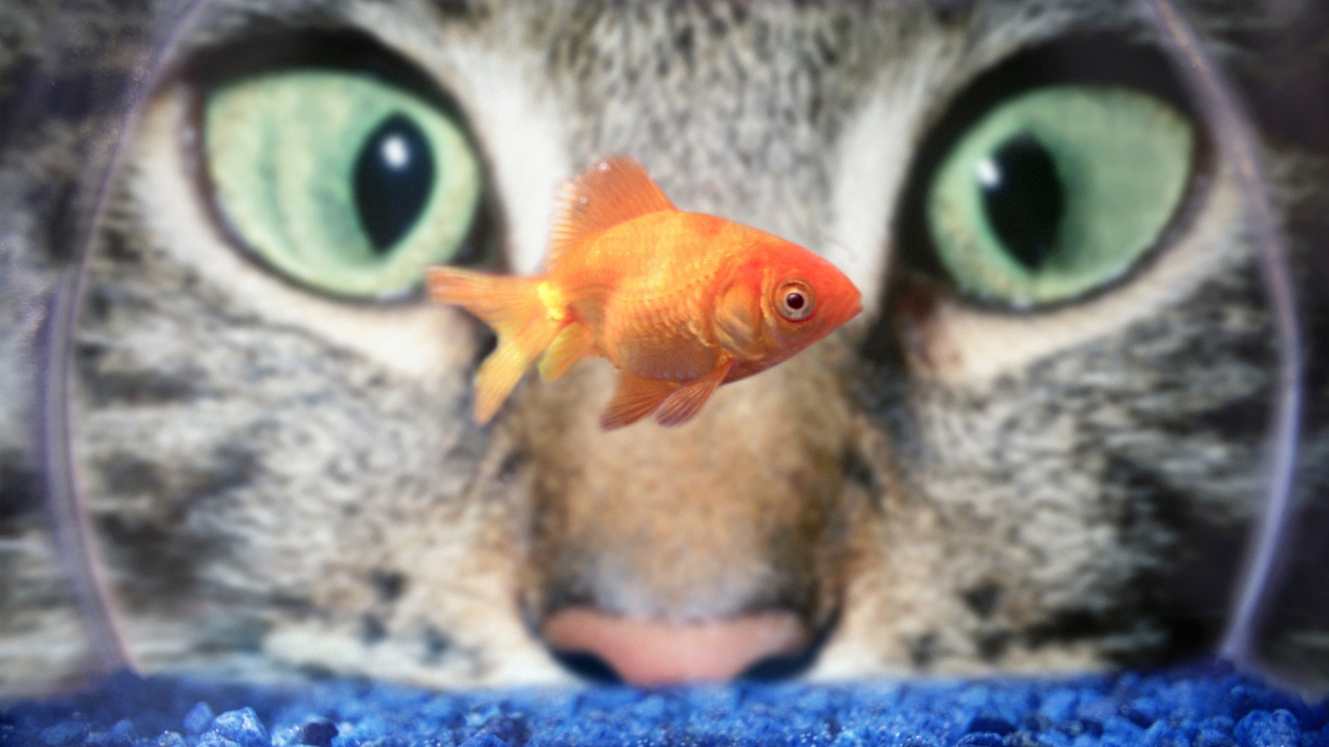 Nettes Foto einer Katze, die einen Goldfisch ansieht