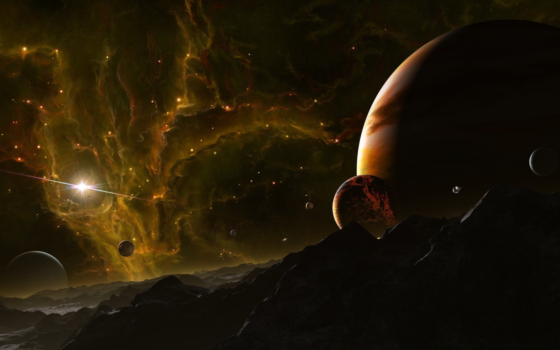Licht vom Planeten in der Galaxie in gelb-schwarzen Farben