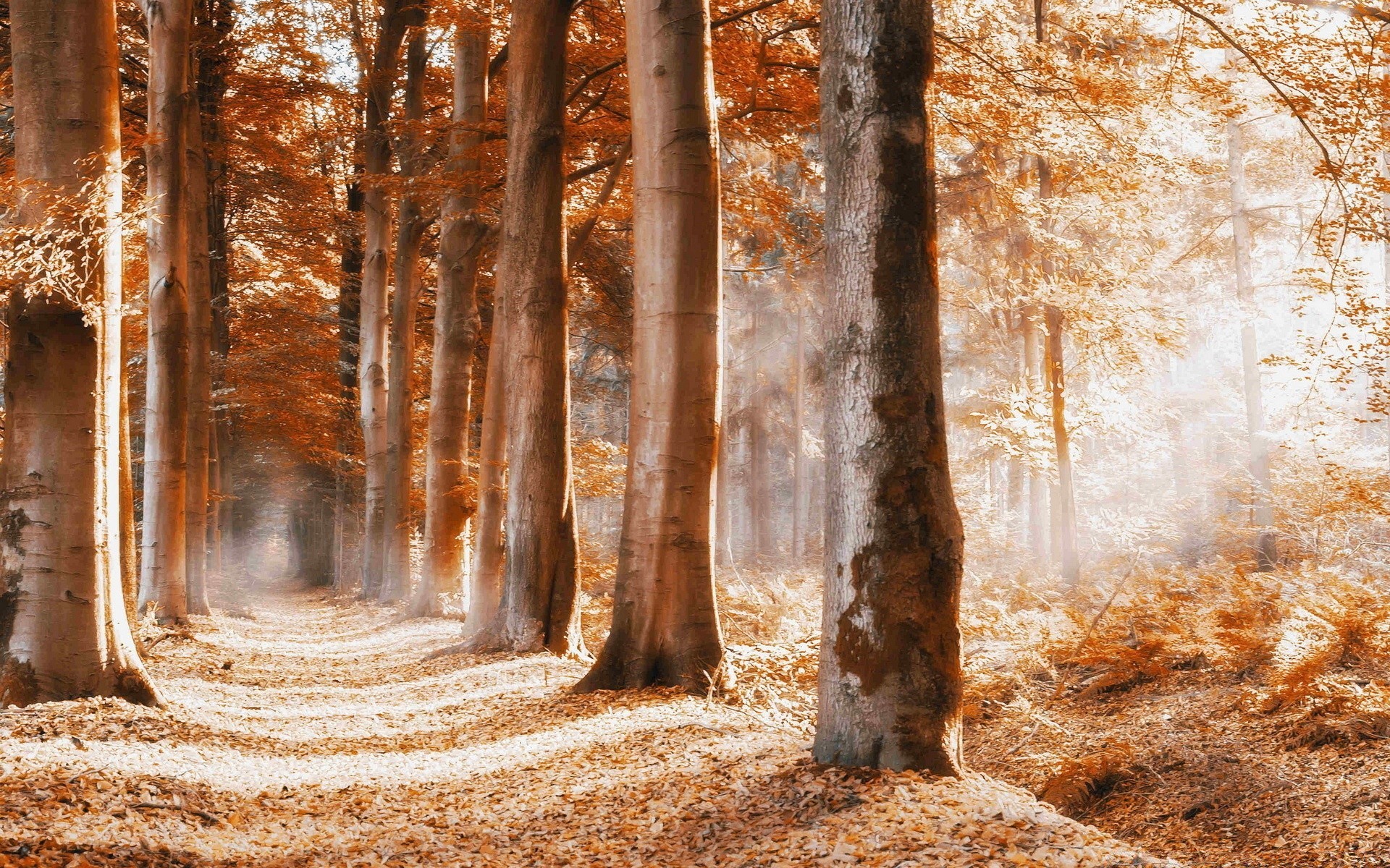 Herbstwald. Bäume im Herbst. Laub auf dem Weg