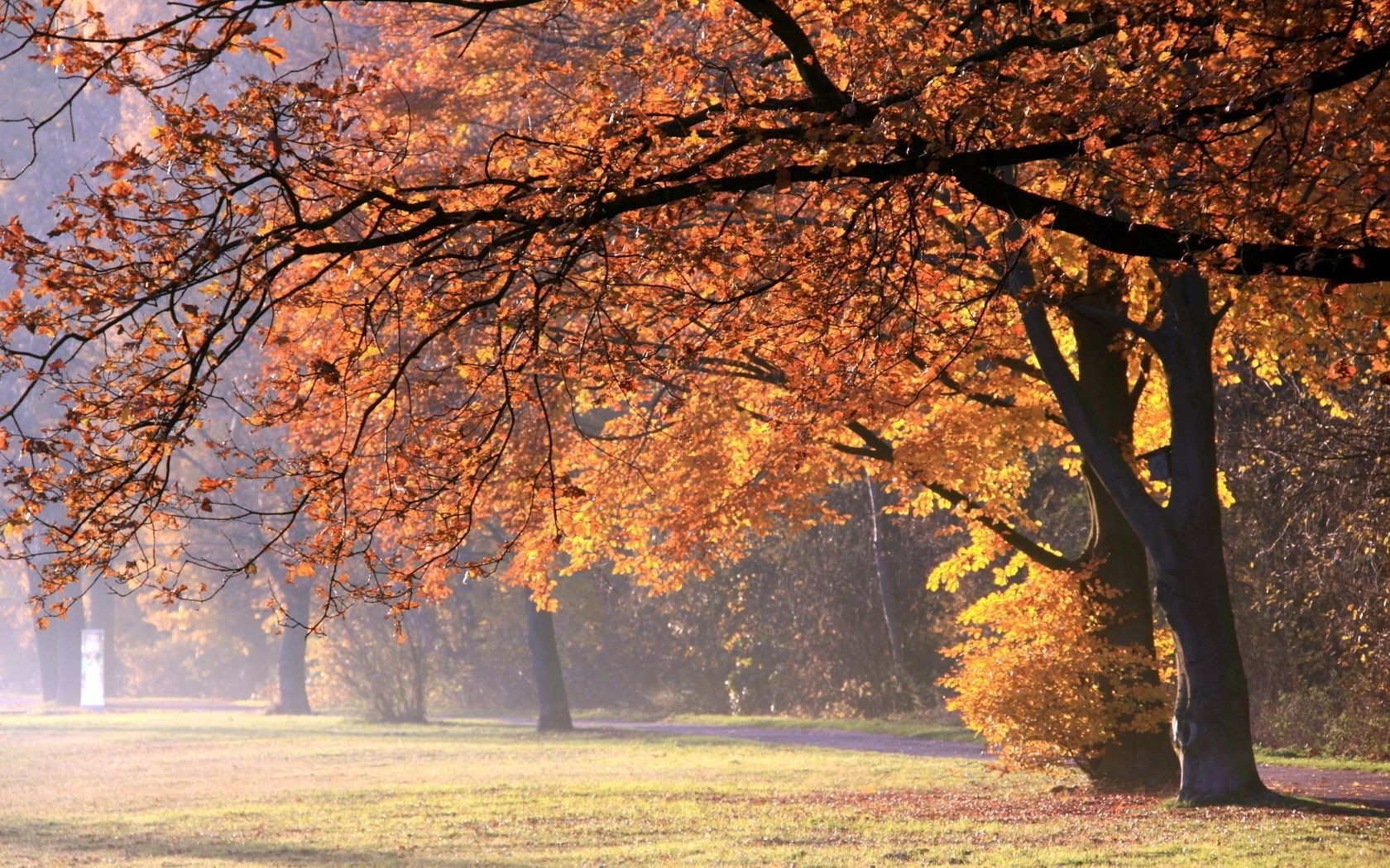 Teppich aus gelben blättern postwellen in dunklen dicken bäumen mit großen kronenTeppich aus gelben Blättern Postwellen in dunklen dicken Bäumen mit großen Kronen