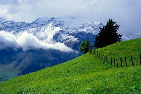 Vor dem hintergrund der schönen landschaft der berge fährt ein zugVor dem Hintergrund der schönen Landschaft der Berge fährt ein Zug