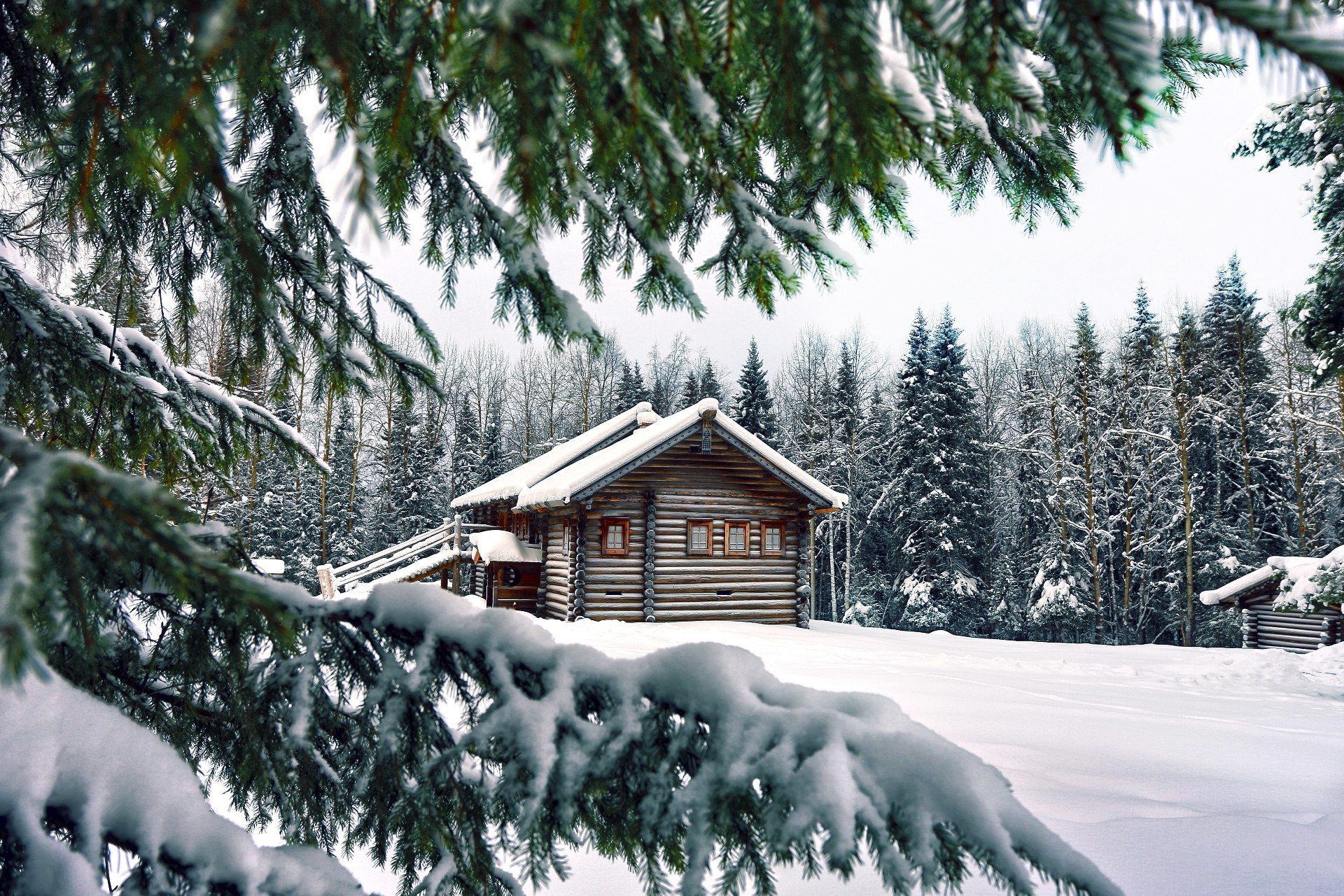 Blockhütte inmitten eines schneebedeckten Fichtenwaldes