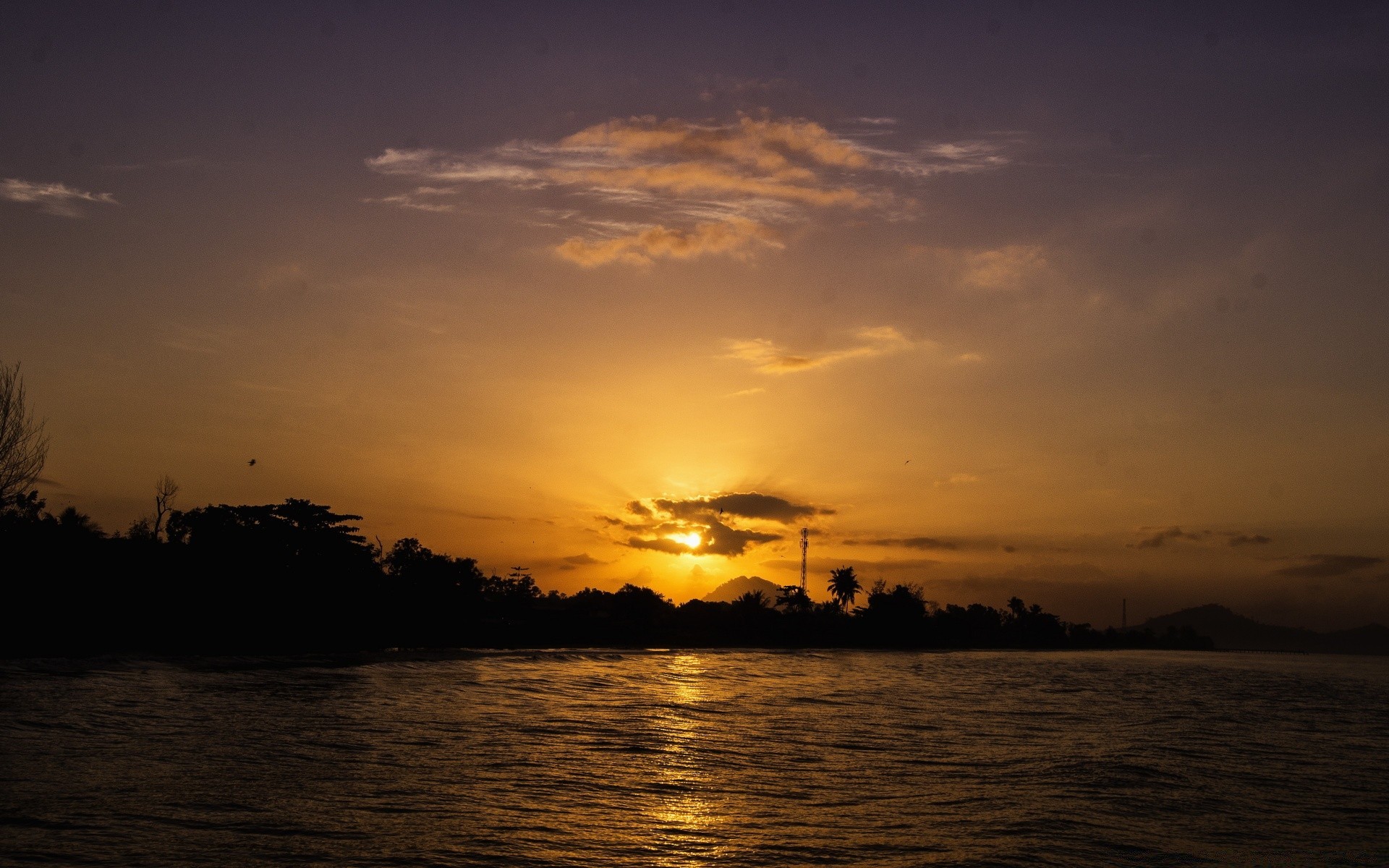 Blick auf das grasbewachsene Ufer, den See und die Morgendämmerung