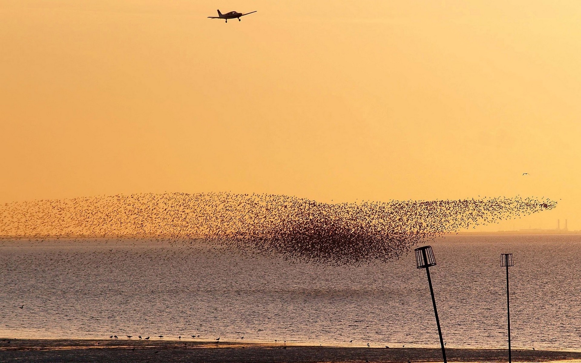 Das Flugzeug fliegt über den Strand und eine Herde von Vögeln