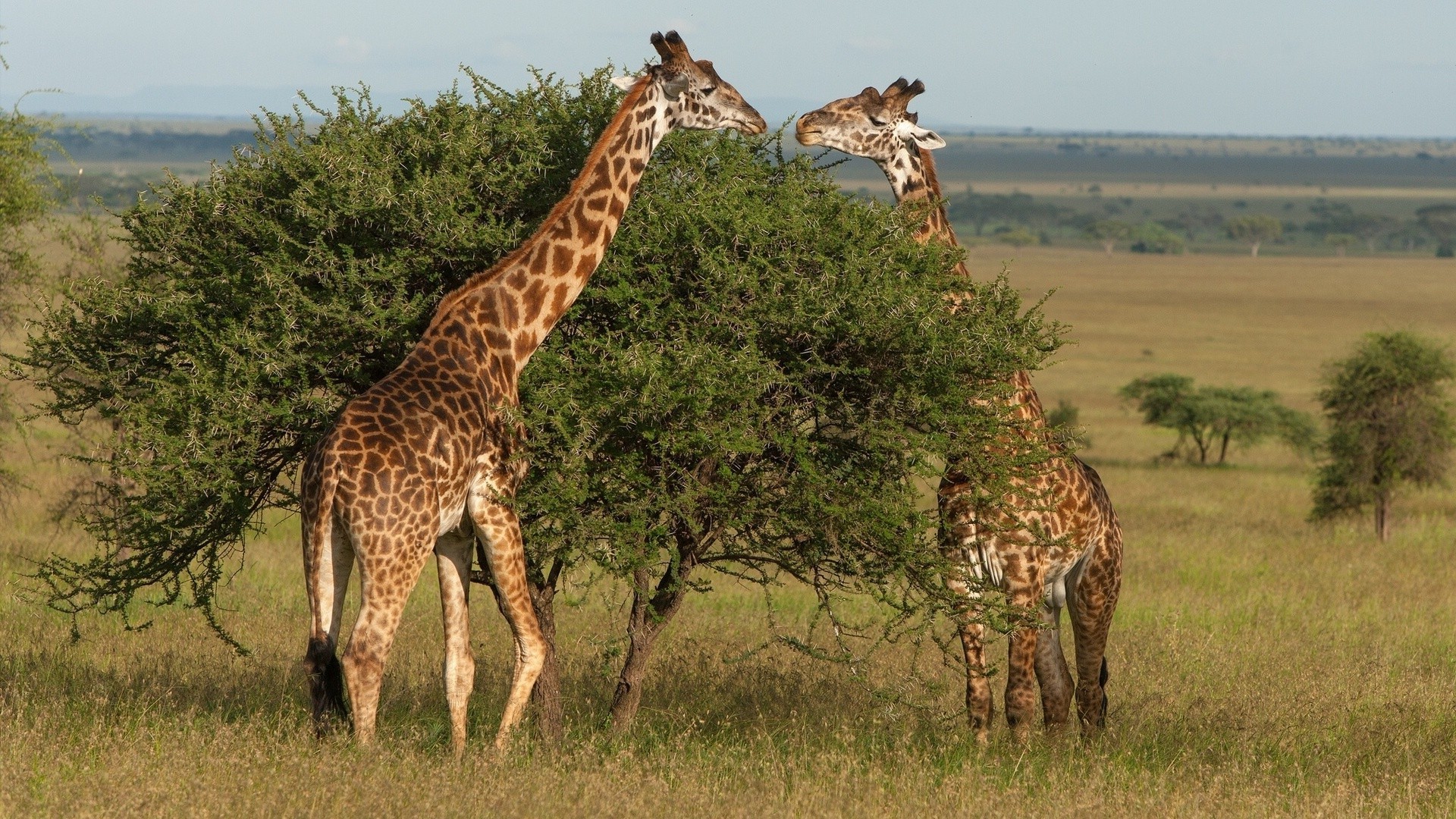 Zwei Giraffen fressen einen Busch in der Savanne