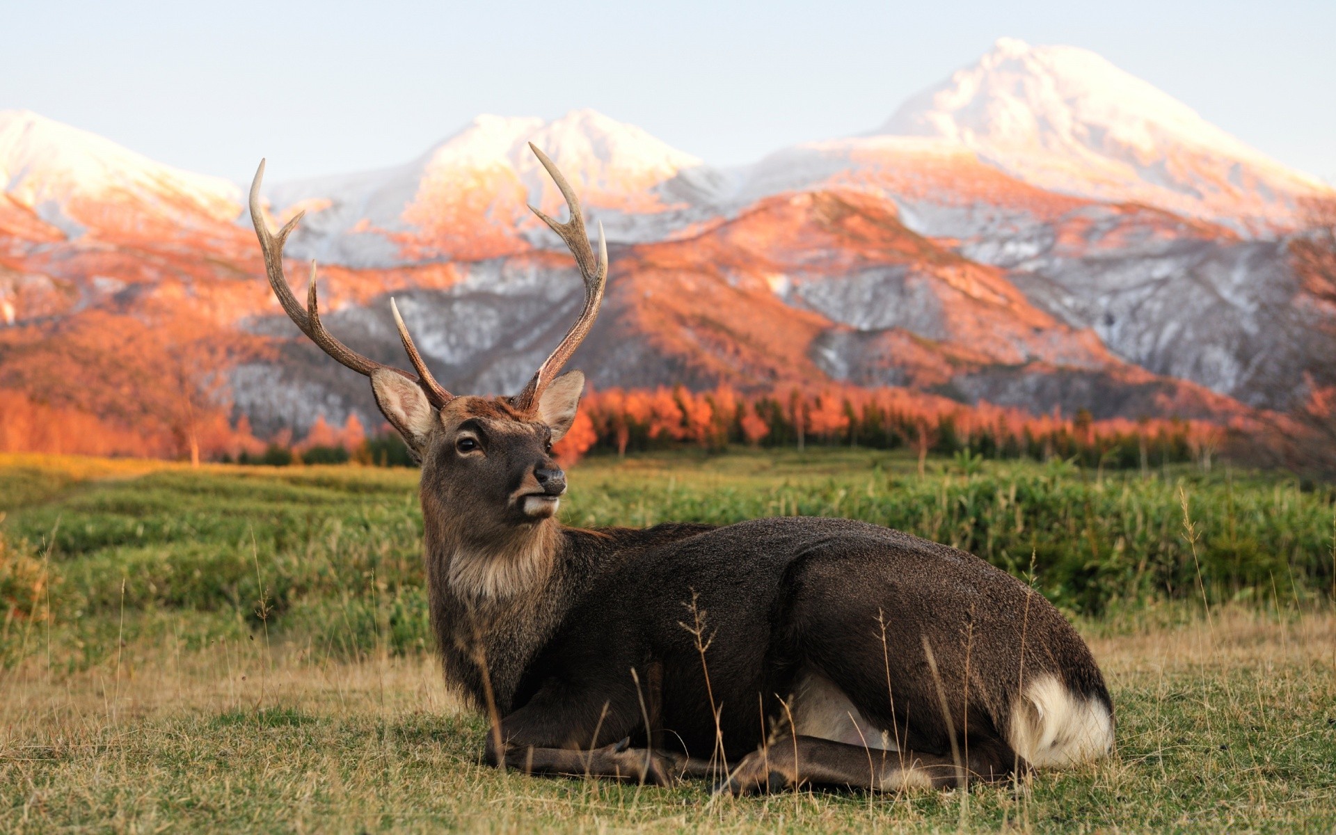 Ein reh ruht auf dem gras vor dem hintergrund der bergeEin Reh ruht auf dem Gras vor dem Hintergrund der Berge