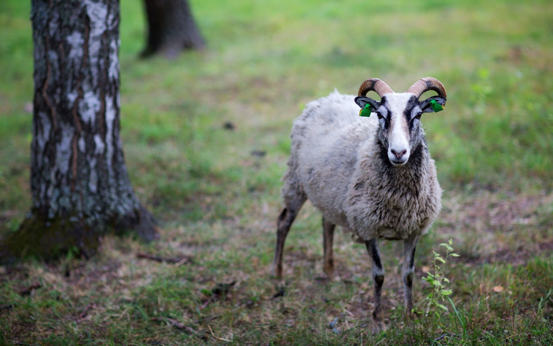 Ein Widder auf dem Rasen neben einem Baum