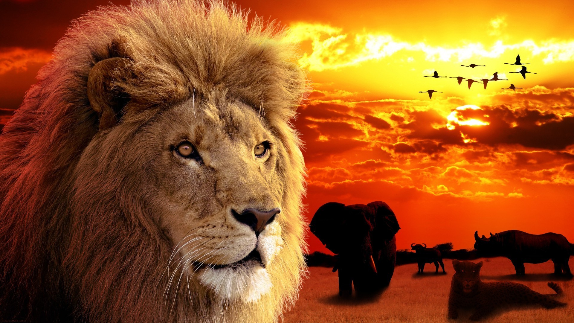 Ein stolzer Löwe vor dem Hintergrund von Elefanten und Nashörnern