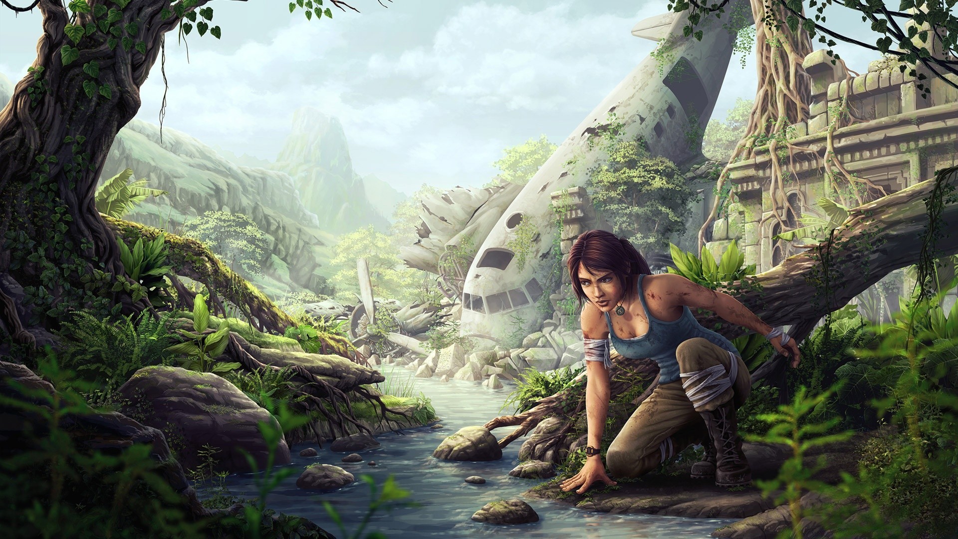 Abbildung einer Frau in der Nähe eines Wasserfalls