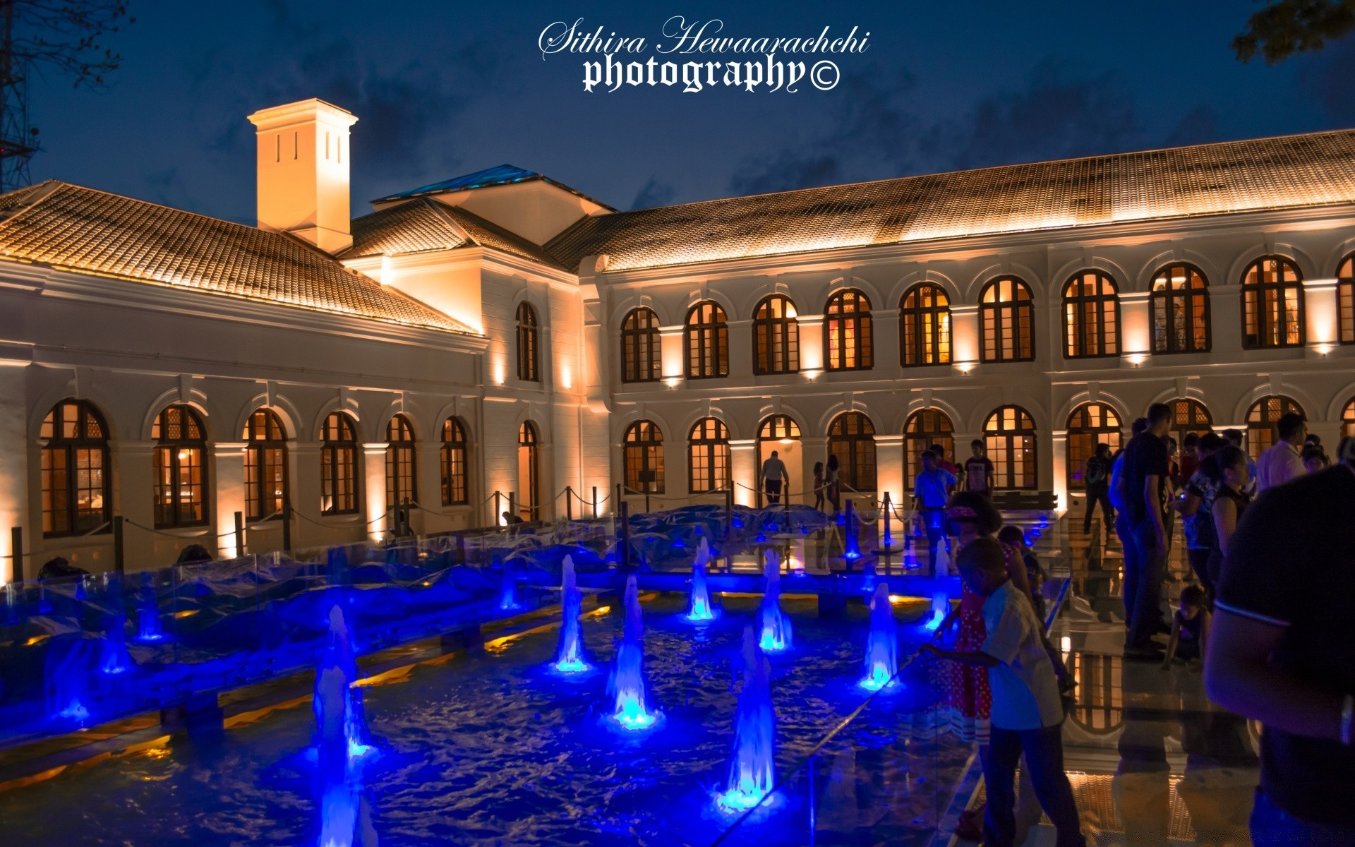 Am Abend leuchtende Springbrunnen bei Führungen
