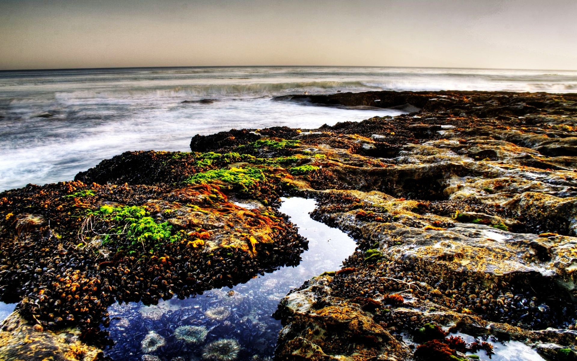 Meeresstrand. Algen. Dunkle Töne