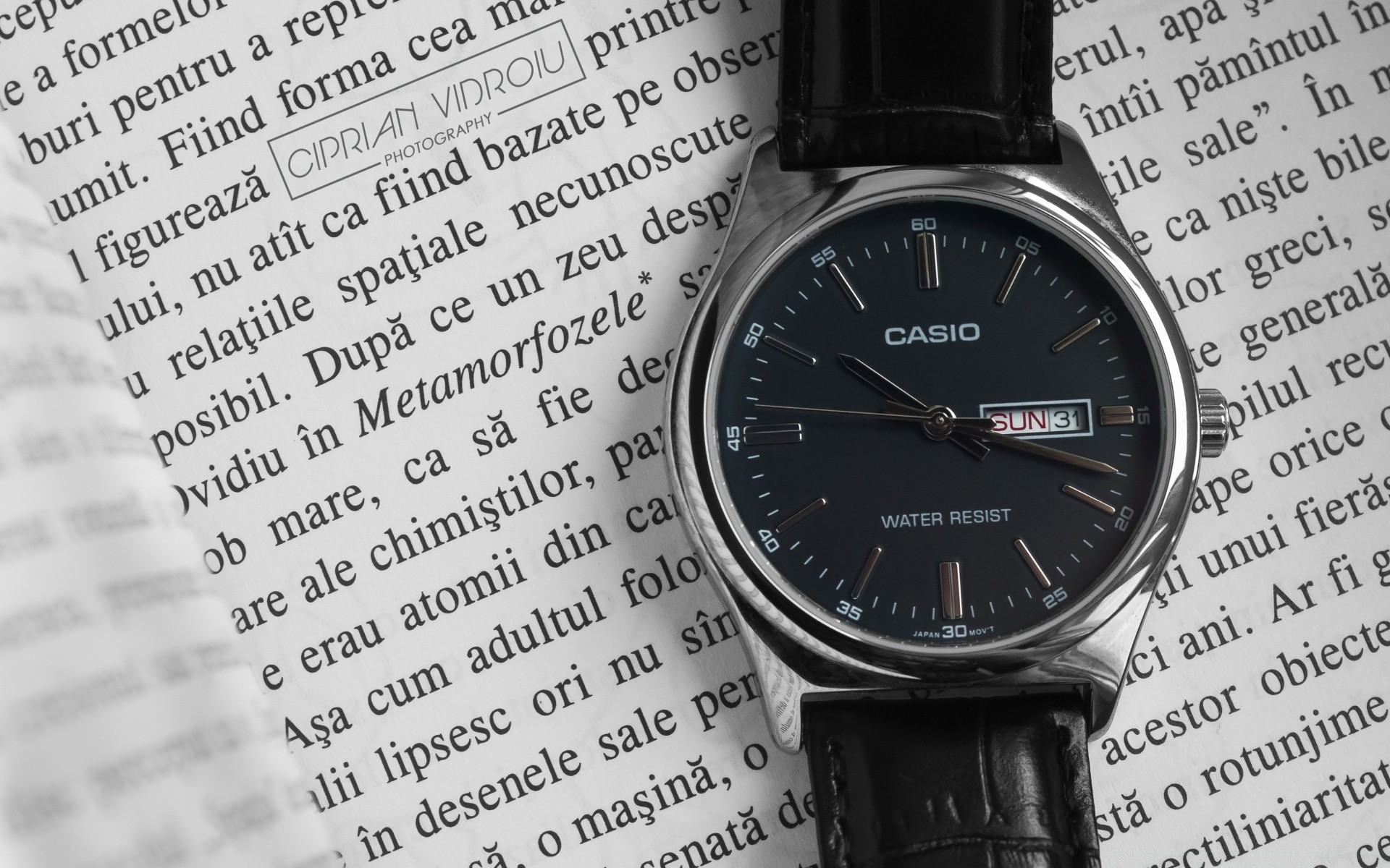 Eine Uhr mit schwarzem Zifferblatt liegt auf einem Buch
