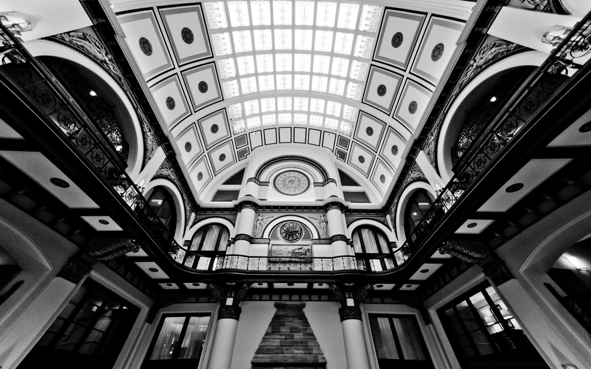Eine Uhr an der Wand eines riesigen Saals in Schwarz-Weiß