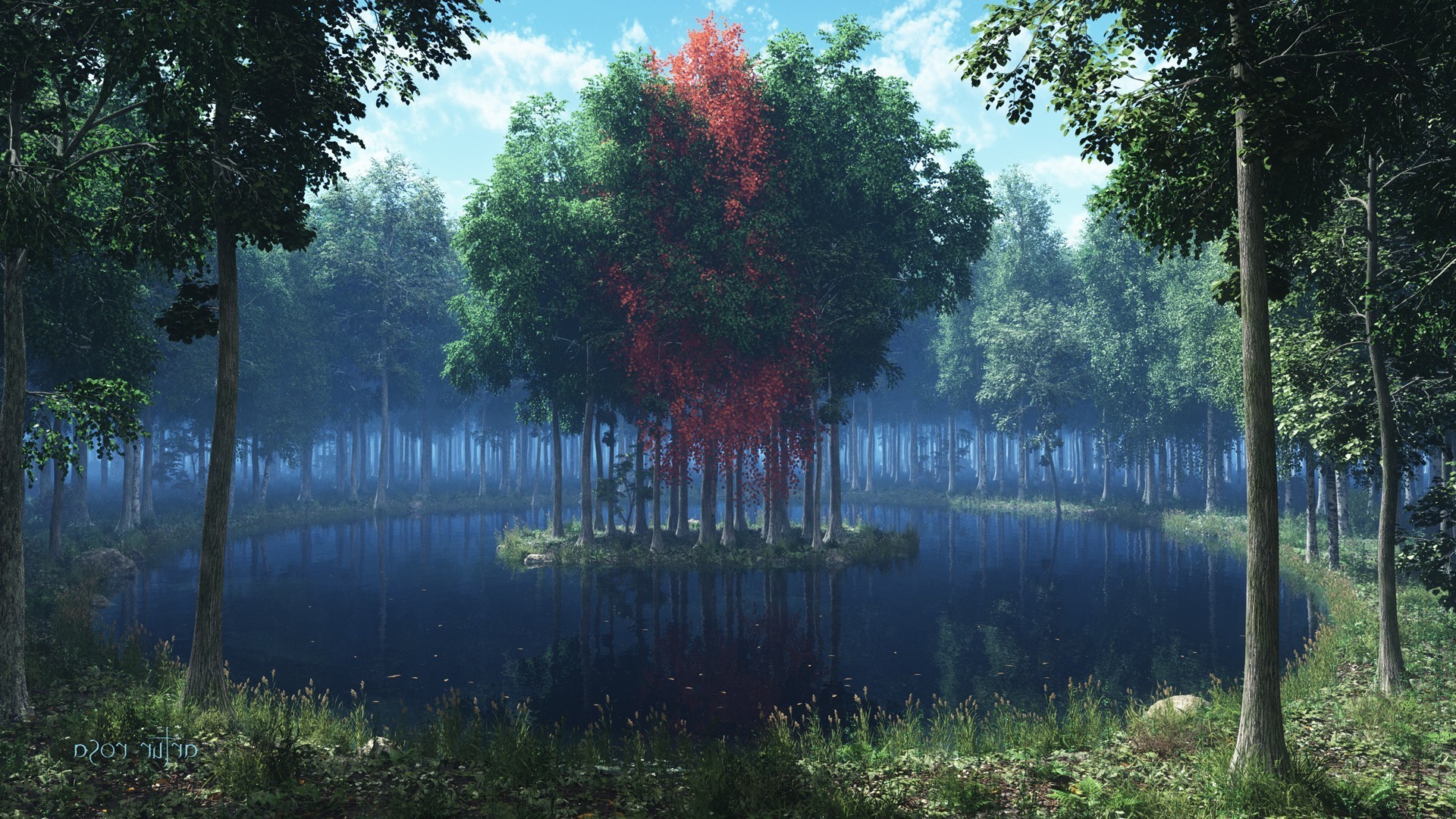 Eine Insel mit Bäumen in der Mitte des Sees