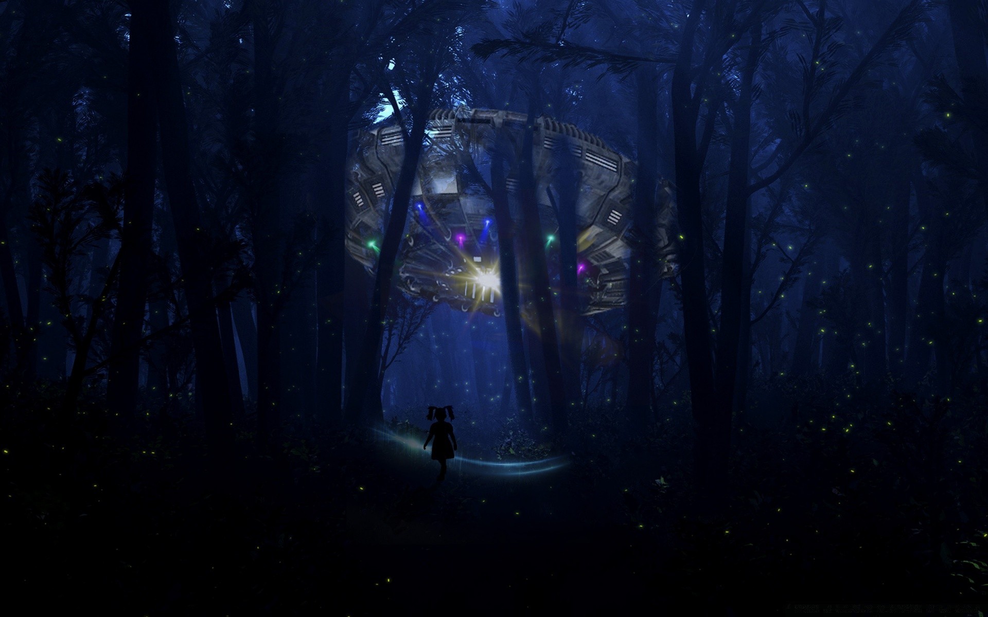 Ein Mädchen im dunklen Wald trifft ein UFO